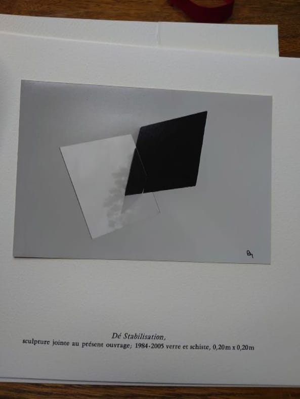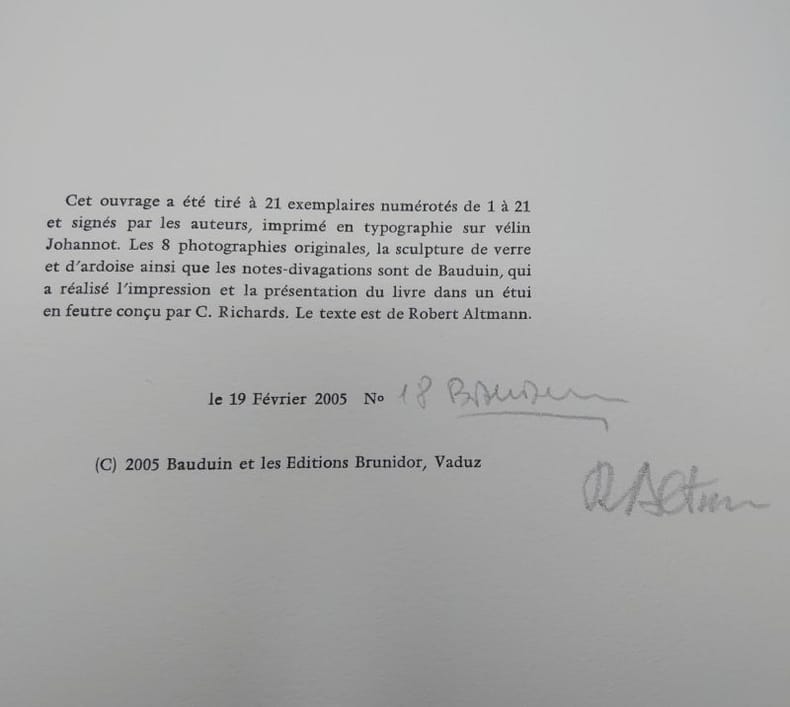 Vaduz, Bauduin et les Éditions Brunidor, 2005. 20 x 20 cm, en feuilles sous chemise imprimée, sous étui en feutre. Étui très légèrement usé sinon bel exemplaire. Édition originale tirée à 21 exemplaires numérotés et signés par les auteurs, imprimée en typographie sur vélin Johannot. Les 8 photographies originales, la sculpture de verre et d'ardoise ainsi que les notes-divagations sont de Bauduin, qui a réalisé l'impression et la présentation du livre dans un étui en feutre conçu par C. Richards. Le texte est de Robert Altmann.