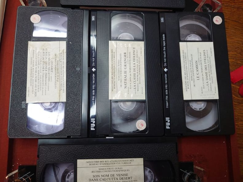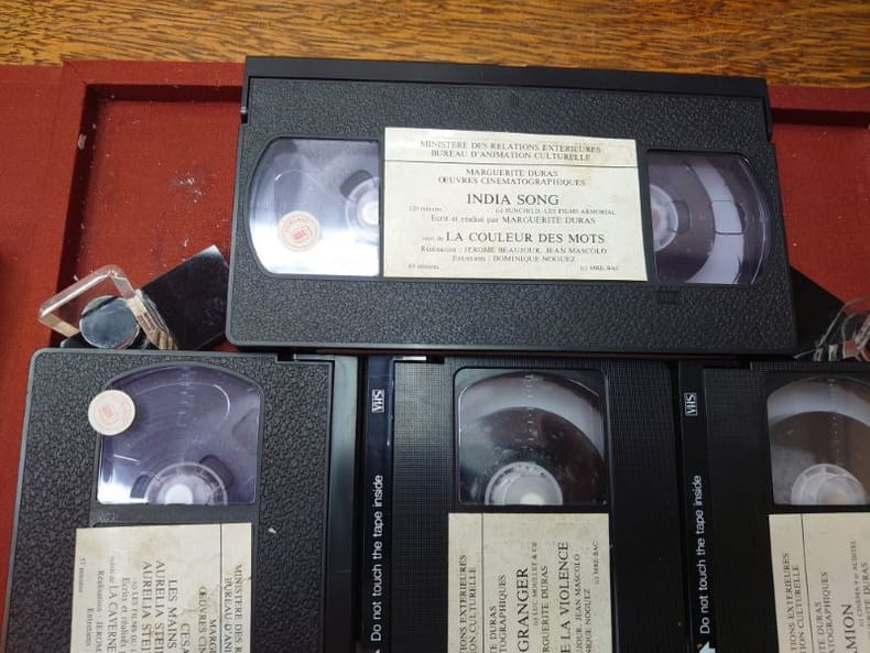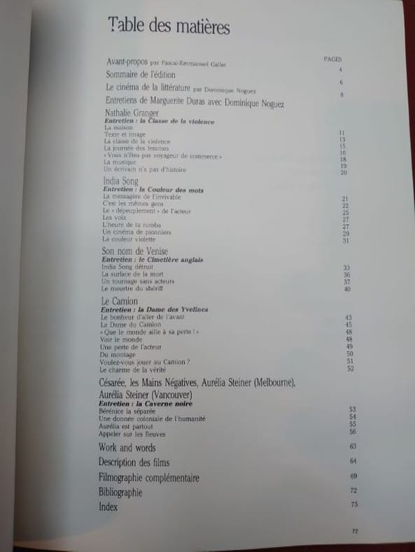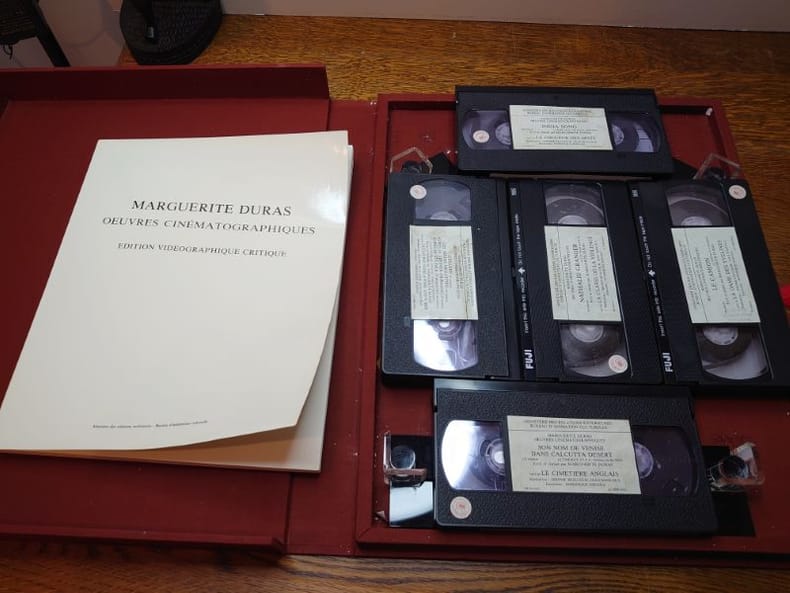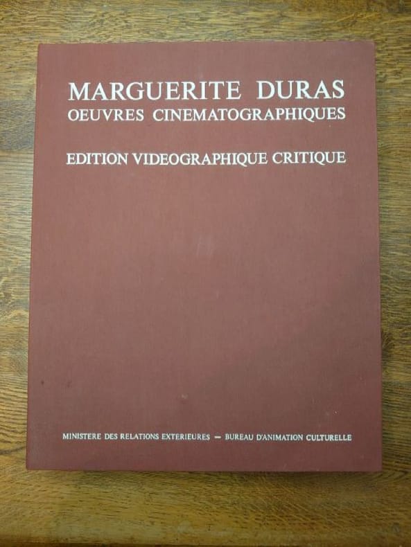 Ministère des relations extérieures. Bureau d'animation culturelle, 1984. Dans un coffret pleine toile d'éditeur, un livre broché de 80 pp. et de cinq videocassettes des films de M. Duras. Étui légèrement usé et sali sinon bon exemplaire.