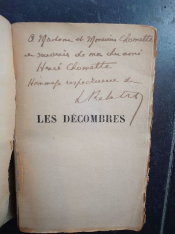 Paris, Éditions Denoël, 1942. 18,5 x 12 cm, 669 pp. Broché en mauvais état, couvertures détachées, à relier. Envoi autographe signé de l'auteur à monsieur et madame Chaumette "en souvenir de mon cher ami Hervé Chaumette". Envoi donc aux parents d'Hervé Chaumette, cinéaste décédé en 1941, frère de René Clair (pseudonyme de René, Lois Chomette).