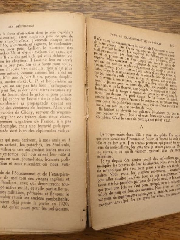 Le premier volume reprend "Les Décombres", expurgé des 174 dernières pages ultra-antisémites de Thèmes et réflexions, le tome II est en édition originale. Volumes bien complet des papillons "avertissement" de l'éditeur, collés au dos des pages de titre : "Certains lecteurs vont être choqués par la republication des Décombres, livre de polémique fasciste et raciste ..."