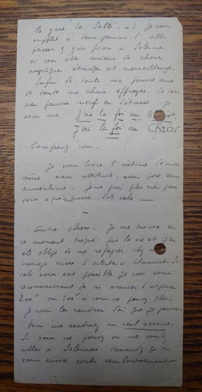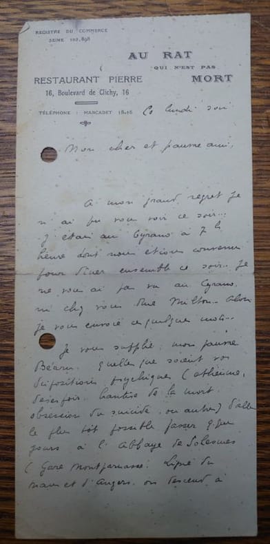 1920 1 feuillet recto-verso, 9 x 20 cm, la fin manque, deux trous de classeur, non datée [circa 1926, date à laquelle Gengenbach est hébergé chez le graveur Alexeïeff à Clamard], à l’enseigne du restaurant Pierre (dont la devise, reproduite sur le document, est « Au Rat qui n’est pas mort ». Lettre écrite après un rendez-vous manqué. « Je vous supplie mon pauvre Béarn, quelles que soient vos dispositions psychiques (athéisme, désespoir, hantise de la mort, obsession du suicide ou autre) d’aller le plus tôt possible passer quelques jours à l’abbaye de Solesmes (Gare Montparnasse. Ligne du Mans et d’Angers. On descend à la gare de Sablé…) Je vous supplie à deux genoux d’aller passer quelques jours à Solesmes si vous êtes curieux de chose mystique, étrange et merveilleuse… Enfin de toute ma pauvre âme, de toute ma chair effrayée, de tous mes pauvres nerfs en détresse, je vous crie : J’ai la foi au Christ. J’ai la foi au Christ. Comprenez-vous… Je vous livre l’intime de mon âme, sans attitude, sans pose, sans surréalisme. Je ne puis plus rien pour vous après avoir dit cela… »