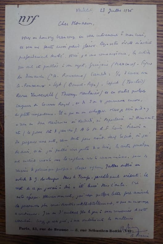 Un feuillet recto sur papier à en tête de la NRF. Adressée à une personne inconnue, au sujet de son abandon du communisme. « Diplômé des Langues Orientales, il devient attaché culturel et effectue son premier séjour en URSS en 1925. Deux ans plus tard, il revient en France, rencontre Jean Paulhan, devient le secrétaire de Gaston Gallimard. D’abord communiste au moment de son séjour en URSS, il se détache de ces idées au début des années 1930 », explique Claire Gruson dans un article intitulé « Benjamin Fondane lecteur de Brice Parain ».