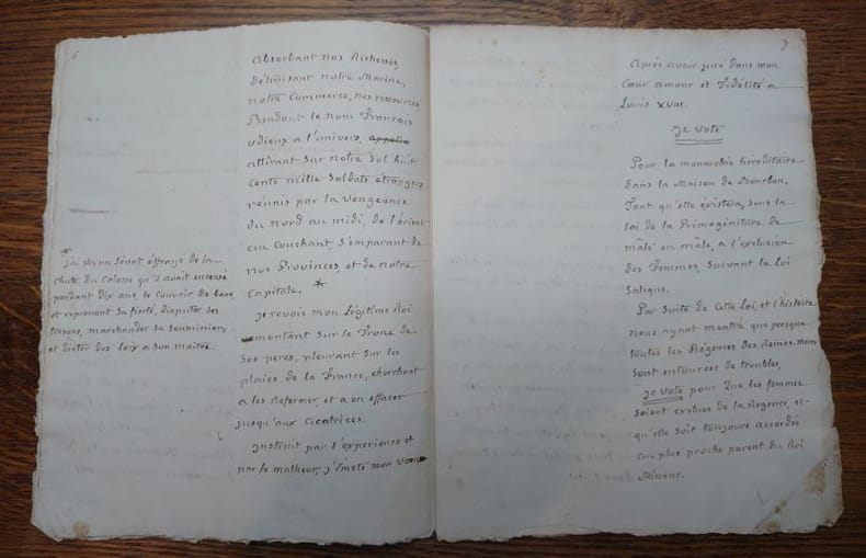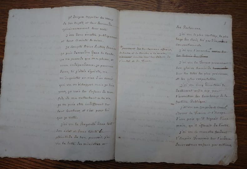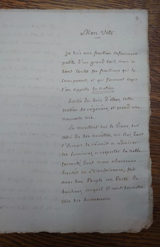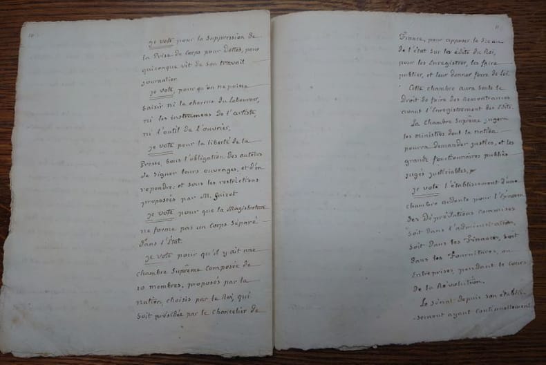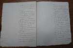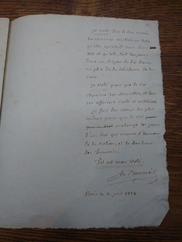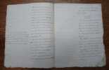13 pp. in-4°. De Beauvoir, ancien bibliothécaire du Roi, expose sa ici sa conception de la politique la veille de la promulgation de la Charte constitutionnelle. Dans un premier temps il fait un résumé critique de la période désastreuse qui a suivi la chute de la royauté. "J'ai vu la Royauté dans tout son éclat et dans toute la plénitude de son pouvoir. J'ai vu la lutte des ministres et des Parlemens. J'ai vu le plus vertueux, le plus Sage des Rois, lié d'impudens conventionnels. J'ai vu l'anarchie poussant des hurlemens affreux, la hache et la torche à la main, assise sur les débris du trône. J'ai vu la Terreur provenant son glaive homicide sur les têtes les plus précieuses et les plus respectables..." Il propose ensuite un projet de constitution en 22 articles dont "le rétablissement du royaume de France tel qu'il était sous Louis XVI..." "Je vote pour l'abolition du supplice de la guillotine..." "Je vote pour qu'on ne puisse saisir ni la charrue du laboureur, ni les instrumens de l'artiste, ni l'outil de l'ouvrier..." Une "fantaisie politique" royaliste.