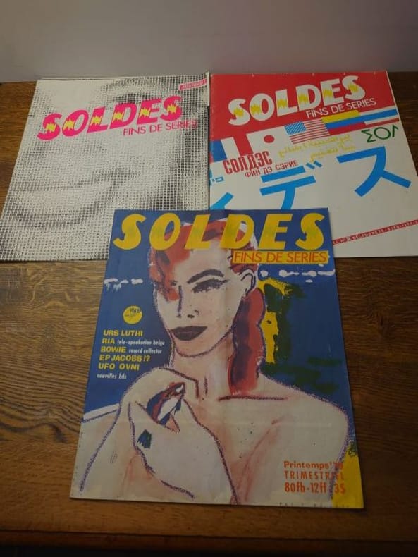 Bruxelles, ADN productions (a.s.b.l.) /Ateliers Du Namurois, 1978/1979/1980/1981. 35 x 29 cm, 5 volumes, les numéros 1, 2 et 3 et le numéros 7 et 10. Volumes agrafés. Bons exemplaires. La revue Soldes, c’est une histoire belge à l’énergie débordant outre-Atlantique. Andy Warhol l’a même qualifiée de «plus belle revue du monde» en 1980, avant de poursuivre : «Les Belges sont incroyables.» Commentaire qui a immédiatement propulsé le magazine sur le devant de la scène internationale. Marc Borgers avait interviewé Warhol pour Soldes Fins de séries sous le pseudonyme de «Jean Dupond de New York City». La revue est née dans le monde de l’underground bruxellois de la fin des années 70. «Soldes Fins de Séries, c’était un trimestriel basé à Bruxelles, notre réponse post-punk/new wave à une époque où nous étions dopés à la musique et aux idées nouvelles», raconte Marc Borgers. La revue raconte alors des tranches de vie en partant à la rencontre de personnages hauts en couleur : l’acteur qui a incarné Tintin au cinéma, une «voyante extralucide», une coiffeuse de Charleroi et même un monsieur chargé de maquiller l’entre-jambes des femmes faisant la couverture de magazines érotiques. Anne Degavre, professeur à l’École de recherche graphique a été embauchée pour faire la mise en page de Soldes en 1980, à peine sortie d’école d’art : «Marc voulait quelqu’un qui n’avait jamais fait de graphisme pour qu’il n’ait pas d’idées préconçues. Ça tombait bien, plaisante-t-elle.C’était une aventure joyeuse et décalée, ultra-originale au niveau du graphisme et du contenu. Ce qui est certain, c’est que Soldes, il n’y avait pas deux revues comme elle.»