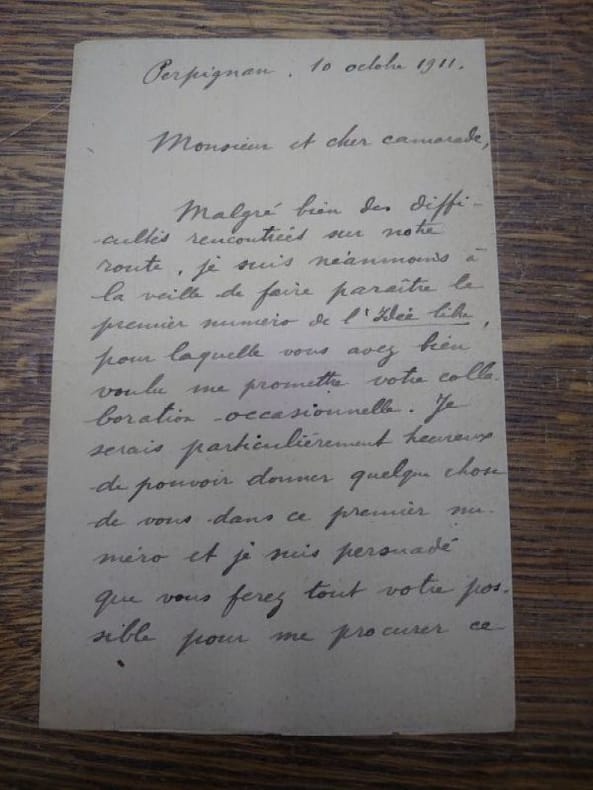 10,5 × 17 cm, 2 pp. Il annonce à son correspondant la parution en novembre du premier numéro de L’Idée libre, « malgré bien des difficultés rencontrées sur [leur] route », et sollicite auprès de lui un article.