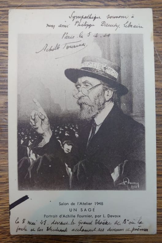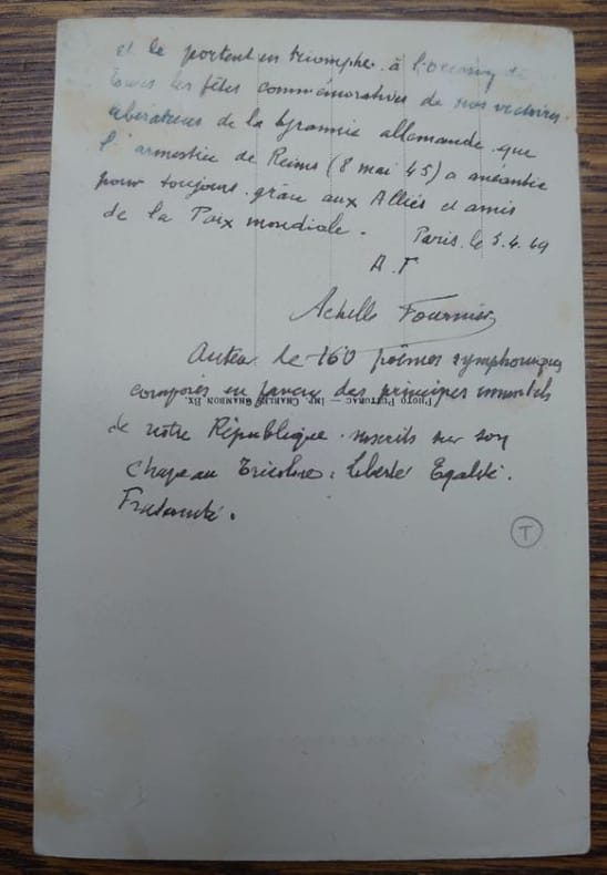 1949 Datée d'avril 1949, 9 × 13 cm, 2 pp. Fournier évoque, sur la carte à son effigie, le glorieux souvenir d’un discours qu’il a prononcé à la Libération de Bordeaux. Il signe « Achille Fournier, auteur de 160 poëmes symphoniques composés en faveur des principes immortels de notre République inscrits sur son chapeau tricolore ». Recensé par André Blavier (Les Fous littéraires, Paris, Henri Veyrier, 1982, rééd. Paris, Éditions des Cendres, 2001), Fournier fait aussi partie des auteurs de l’Anthologie de la poésie naturelle de Camille Bryen et Bernard Gheerbrant (Paris, K éditeur, 1949), avec notamment Jean-Pierre Brisset, Gaston Chaissac, Ferdinand Cheval et le Douanier Rousseau.