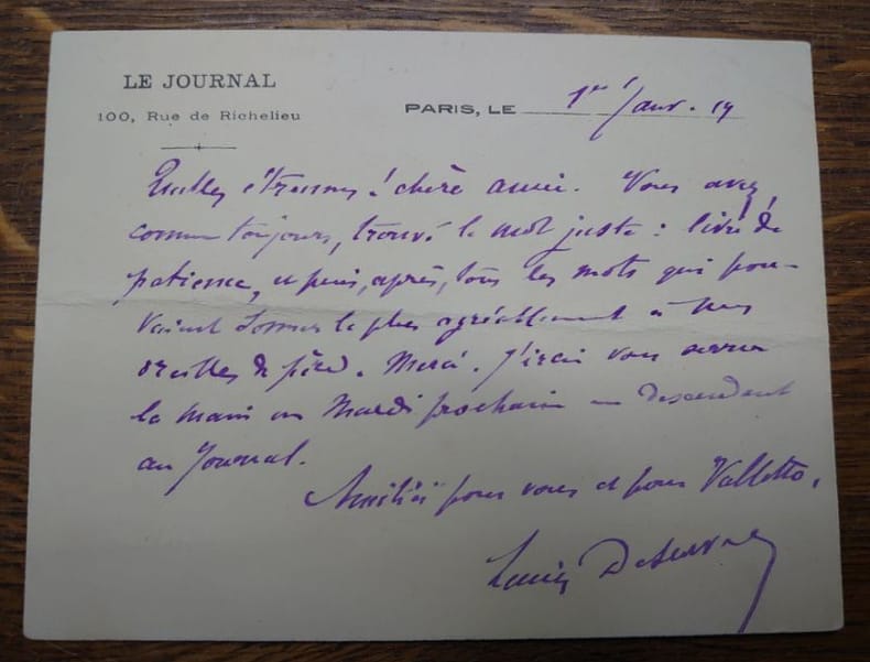 Il la remercie pour avoir, « comme toujours, trouvé le mot juste ». « J’irai vous serrer la main un mardi prochain en descendant au Journal. Amitiés pour vous et pour Vallette. »