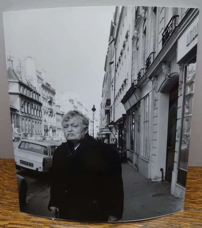 Grande photographie originale en noir et blanc réalisé par Marc Trivier. Tirage argentique original non signé, comme la plupart des uvres de Trivier. Découpe irrégulière sur le bord droit de la photographie. Précieuse épreuve argentique originale du célèbre photographe belge, un des artistes contemporains les plus secrets, qui malgré un succès international précoce, a préféré limiter sa production pour conserver la cohérence de son uvre. Marc Trivier ne tire pas de nouveaux exemplaires de ses anciens portraits, le papier de tirage qu'il utilisait n'est d'ailleurs plus commercialisé. L'artiste «réalise lui-même ses tirages sur papier baryté Ilford, consacrant plusieurs jours de travail à chacun, avec une concentration particulière pour rendre les blancs, par contraste avec des noirs d'une rare densité. Un tirage de Marc Trivier ne ressemble à aucun autre. Lorsqu'il accepte de les exposer, il les suspend dans des cadres en inox de sa fabrication, laissant libre cours à la vie du papier.» (Xavier-Gilles, « Marc Trivier et la tragédie de la lumière » inLe Monde Libertaire, 2011). Cette «vie du papier» participe de l'uvre au même titre que les diverses altérations que subissent les photographies lorsqu'elles sont exposées : «Dans les boites, les tirages gondolent, mais qu'importe: le photographe affectionne ce genre d'accident.» (Claire Guillot, «Les face à face sans échappatoire du photographe Marc Trivier», Le Monde, 2011). Marc Trivier a une sensibilité particulière pour l'aspect matériel de ses productions. Alors que la photographie relève par essence du multiple, cette intervention de l'artiste dans tout le processus de création confère une aura autographique à ces tirages. Photographies d'artistes, de fous, d'arbres ou d'abattoirs, Marc Trivier aborde tous ces sujets avec un regard aussi précis qu'intense. «Dans sa cosmogonie, chaque chose, chaque être, végétal, animal ou humain, mérite le même respect. Car tous sont confrontés à la même loi d'airain : la solitude.» (Luc Desbenoit). La beauté qui émane de ses photos vient de cette nudité. Il n'y a ni retouches, ni recadrages. On retrouve dans son uvre le même format carrésouligné par le carré du négatif que Trivier laisse sur ses tirages. Ce cadrepiège notre regard dans des photographies où le fard de la couleur est rejeté pour un noir et blanc incisif. Toute artificialité ayant disparu nous ne faisons pas face à la mise en scène d'un sujet mais à une présence exacerbée par la lumière irradiante et singulière, témoin d'un instant de vie et non de pose. C'est cette lumière, liée au médium photographique, qui unit les séries de Marc Trivier : «Les photographies de Marc Trivier écrivent une tragédie de la lumière, celle-ci n'accueillant les êtres - hommes, arbres ou bêtes - qu'en les brûlant, avant disparition."» (Xavier-Gilles inLe Monde Libertaire). C'est aussi elle, délivrée de tous les artifices, qui donne à ses uvres l'aura qui les rend si présentes. Cette «brûlure» de la lumièrenous renvoie à un instant réel, au «ça a été» de Barthes (La Chambre Claire, 1980) : «De trente-cinq ans de pratique photographique, d'obsessions, c'est peut-être ça qui reste : un mode d'enregistrement singulier de la brûlure de la lumière, décliné d'une image à l'autre, en une succession de propositions qui se ressemblent et pourtant chacune est aussi singulière que la fraction de temps auquel elle renvoie.» (Marc Trivier). «La photographie ne dit qu'une chose : «C'était.» On ne fixe que ce qui a été. S'il y a une tragédie, elle est là.» (Marc Trivier) Warhol, Foucault, Beckett, Dubuffet ... les plus grands écrivains et artistes ont posés pour Trivier. Simultanément l'artiste s'intéressent également aux marges de la société, à ce que les hommes ne veulent pas voir. Il photographie alors les aliénés et les abattoirs qu'il place en regard des célébrités. Dès la fin des années 1980 son uvre est unanimement reconnue et il reçoit le prestigieux Youn