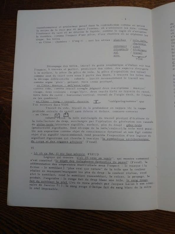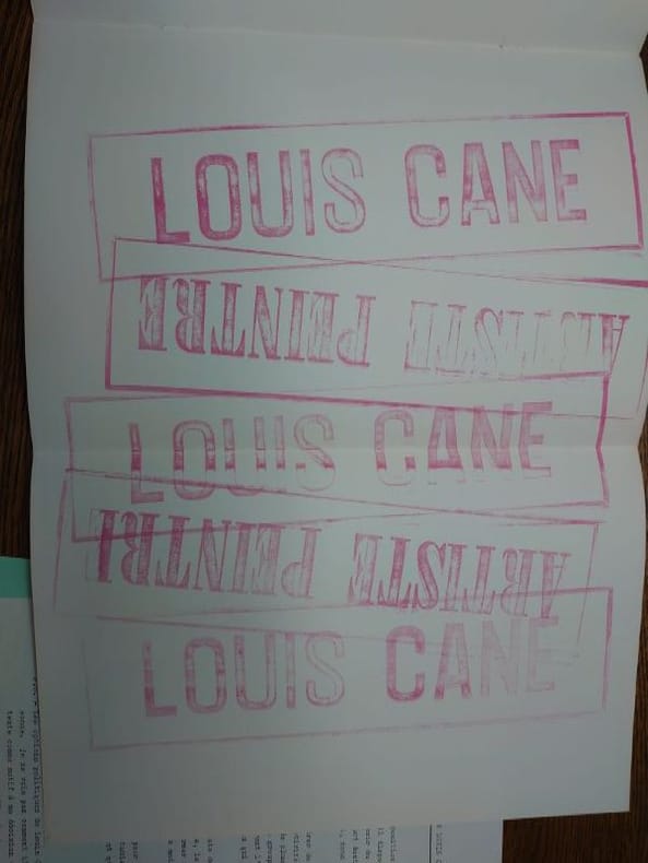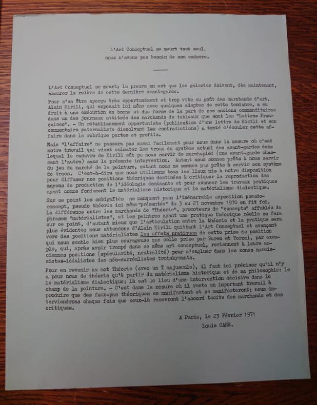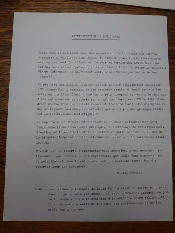 Paris, Daniel Templon, 1971. 30 x 21 cm, 3 et vii pp. Plaquette agrafée en bon état. Insérés, tract de Louis Cane daté de 1971 intitulé "L'Art Conceptuel se meurt tout seul, nous n'avons pas besoin de son cadavre". Louis Cane a distribué ce tract le soir du vernissage de l'exposition, sans demander l'avis du galeriste. Et réponse donc du galeriste Daniel Templon, sous la forme aussi d'un tract inséré. Distribué le jour du vernissage de Louis Cane à la galerie Templon, ce tract est le point de départ de ce qu’il conviendra d'appeler « l'affaire Templon ». Dans ce texte, l'artiste fait référence à l'exposition « Concept Théorie » qui s'est déroulée dans la même galerie en 1970 et à laquelle participait Alain Kirili, Joseph Kosuth, Burgin, Burn, Ramsden ainsi que le groupe Art and Language. Cette exposition lui sert d'ancrage pour critiquer d'une part les ambitions des artistes conceptuels « promoteurs de concepts » et, d'autre part, pour saluer la démarche de Kirili, quittant le camp conceptuel pour se rallier à la cause de Supports/Surfaces : le matérialisme dialectique. Ce tract expose les positions de Cane vis-à-vis du marché de l'art, de l'art conceptuel et insiste sur le matérialisme dont lui et Supports/Surfaces se font les garants. Afin de défendre leur position face au système marchand des galeries et des revues, ils « interviendron[t] chaque fois que ceux-là [les faux pas théoriques] recevront l'accord tacite des marchands et des critiques ». Voulant à la fois se « servir du marché de la peinture » comme diffuseur de leurs pratique et théorie, tout en refusant cependant d’y être « une avant- garde chassant l'autre », Louis Cane adopte une position ambiguë jouant le jeu tout en le dénonçant, et démarrera ainsi une affaire qui s'étalera sur plusieurs mois. Konan Le Coz, in SUPPORTS/SURFACES 1970 – 1972. L’HISTOIRE RACONTÉE PAR LES DOCUMENTS.