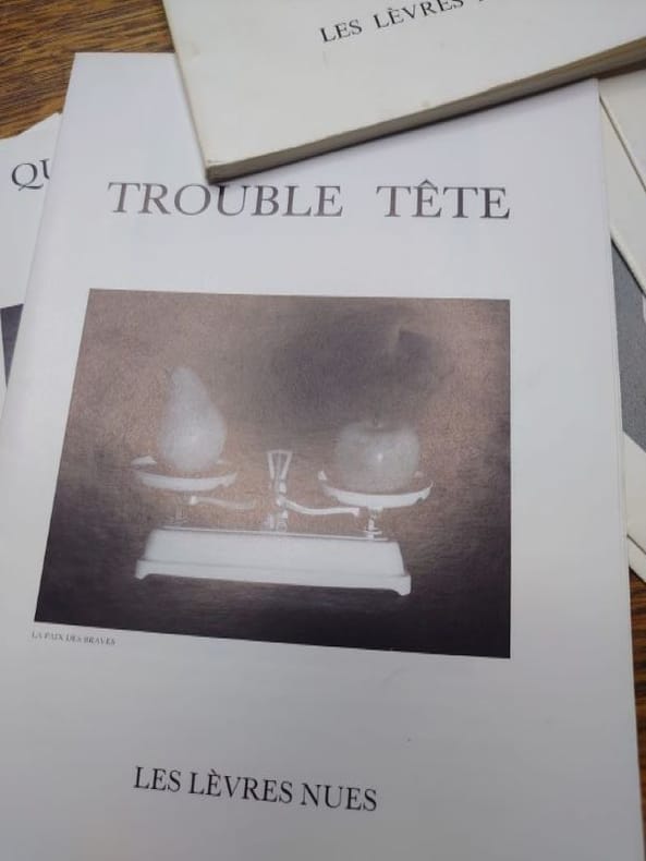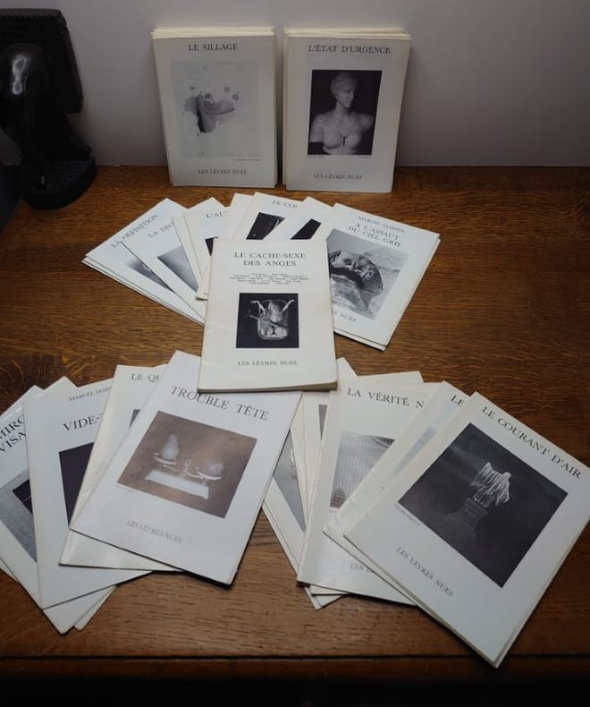 1978 Nous avons : - Année 1978. Une plaquette. Le Cache-sexe des anges. N°3 de la collection "La poursuite". - Année 1988. 5 plaquettes. Dont nous donnons ici les titres : Marcel Marien. Trouble tête. Le qu'en dira t'on. Marcel Marien. Vide-tête. Les miroirs dévisagés. L'a peu près rien. - Année 1989. 7 plaquettes. Dont nous donnons ici les titres : Le courant d'air. Le moment venu.La vérité noire.Syzygies. L'imparfait. L'aiguillée. La vie sauve. - Année 1990. 11 plaquettes. Dont nous donnons ici les titres : Marcel Marien. A l'assaut du ciel gris. La rampe.Le titre. Le contre-feu. Le passé ultérieur. L'autre rive. Hier il fera beau.La diversion. La définition. Le navrement. La clef sur le paillasson. Année 1991. 15 plaquettes. Dont nous donnons ici les titres : L'état d'urgence. Prendre et jeter. De toute façon. Eccéités. Le bûcheron déraciné. La chanterelle. Le zérotage. L'idéation. Le nez dehors. L'obligation de vivre. L'erreur est inhumaine. La veille paradoxale. La formication. L'organeau. On a le temps. L'impossible satisfaction. Année 1992. 16 plaquettes. Dont nous donnons ici les titres : Le sillage. Les mots décroisés. La battée. L'abée. La conduite intérieure. Le passage par la tête. La reposée. La nouaison. L'entrecolonne. Le rose et le noir. L'échelle humaine. La dérobée. La lancée. Le chemin creux. La contenance. Le qui-vive.