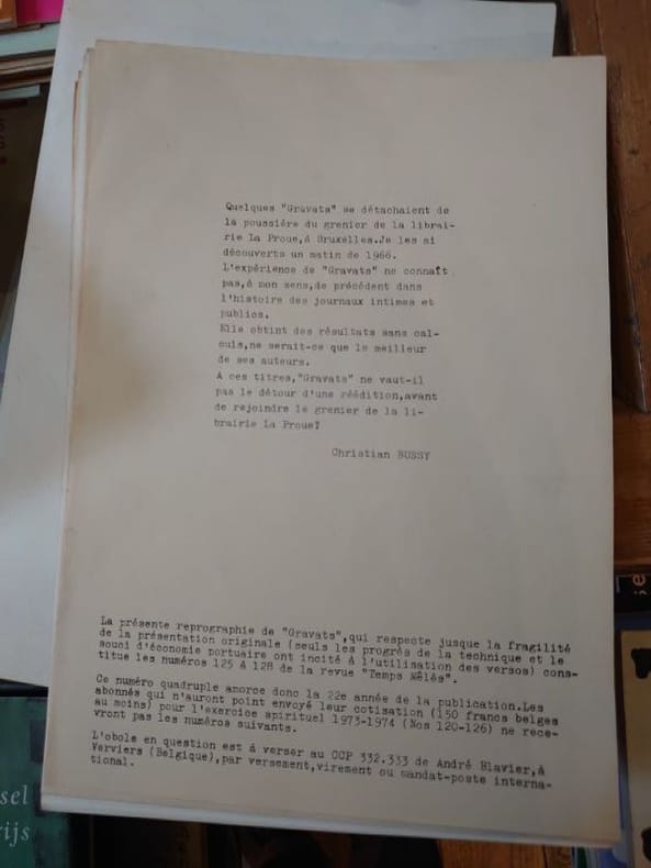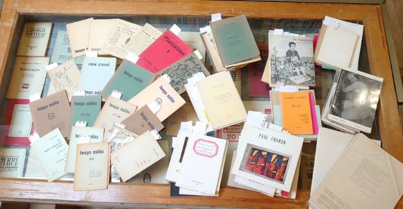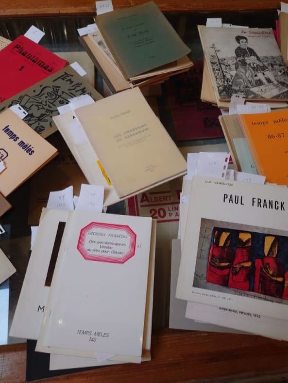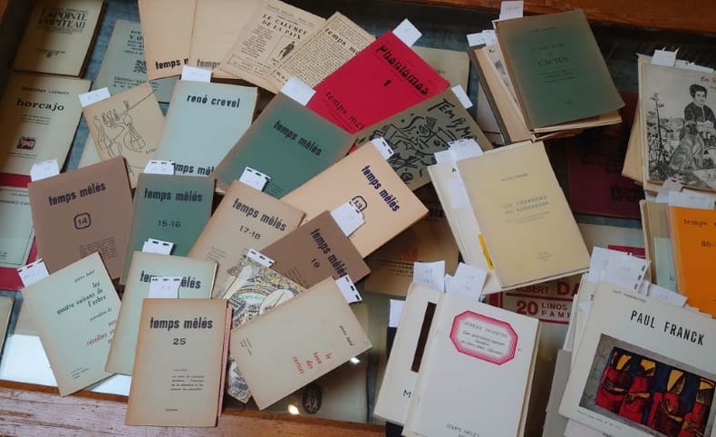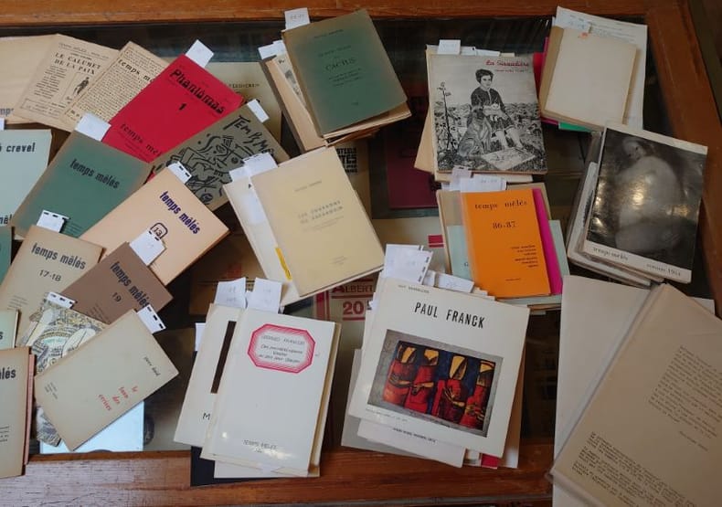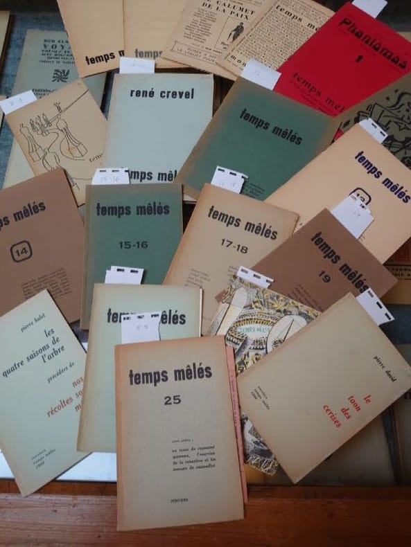 91 fascicules, plusieurs numéros double ou triple. Formats divers, en ff. ou brochés. Quelques livraisons numérotées, l'un ou l'autre ex. de luxe dont le numéro 48 (4 textes de Raymond Quenaeu et un hommage à Boris Vian). enrichi d'une composition "très originale" de Jehan Gaudry : un collage sur une carte postale de Mona Lisa de Leonard de Vinci dont la tête a été remplacée par la tête de La Vache qui rit. Temps mêlés est une revue littéraire belge d'avant-garde, fondée à Verviers en 1952 par Jane Graverol et André Blavier. Contributions de Marcel Béalu, Pierre Halet, Pierre David, Paul Colinet, Achille Chavée, Marcel Marien, Christian Bussy, André Stas, André Blavier, Georges François, Guy Vandeloise, Anatole Jakovsky, Antoine Lemoine, Noel Arnaud, Sodoyan, Agenor, Jean Queval, René Crevel, Frénaud, Koenig, Norge, Picabia, Raymond Queneau, Scutenaire, etc. Illustrations de Magritte, Léger, Topor, Zadkine, et bien d'autres.