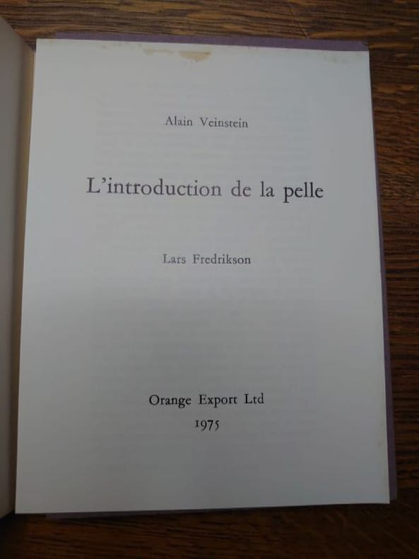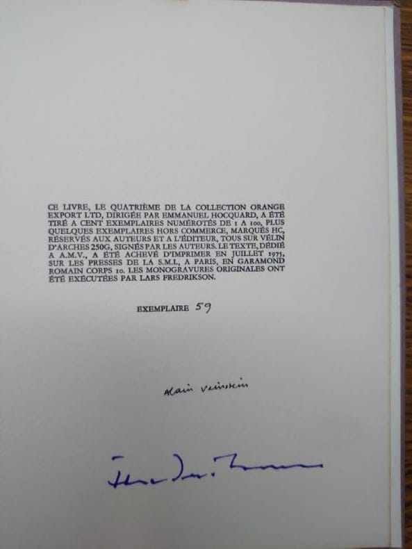 Orange Export Ltd. 1975. In-12 br. Textes d'A. Veinstein, monogravures originales exécutées par Lars Fredrikson. E.O. 1/100 exemplaires numérotés sur Arches, signés au colophon par l'auteur et l'artiste. On joint le bulletin de commande de cette plaquette, encart de 4 pages in-16, texte de Roger Laporte et liste des premières publications d'Orange Export, dirigée par Emmanuel Hocquard. Envoi autographe de Lars Fredrikson.