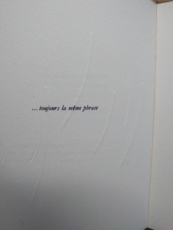 Orange Export Ltd, 1975. 17 x 13 cm, non paginé. Broché én bel état. Textes d'A. Veinstein, monogravures originales exécutées par Lars Fredrikson. Édition originale, 1/100 exemplaires numérotés sur Arches, signés au colophon par l'auteur et l'artiste. On joint le bulletin de commande de cette plaquette, encart de 4 pages in-16, texte de Roger Laporte et liste des premières publications d'Orange Export, dirigée par Emmanuel Hocquard.