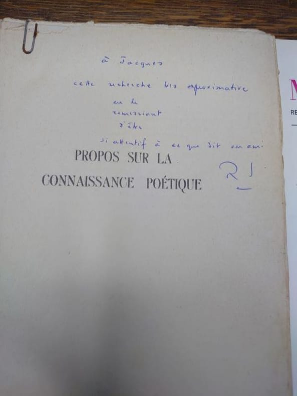 Nous avons : - Lettres d'amour. Jose Millas-Martin Éditeur, collection Périmètre, 1972. Envoi autographe signé de l'auteur à Monique et Jacques [Sojcher]. - Efface, Éveillé. Seghers, collection Froide, 1974. Envoi autographe signé de l'auteur à Monique et Jacques Sojcher. - Bulletin d'enneigement. Collection Sud, 1974. Un des 30 ex. hors commerce numéroté sur Vergé, accompagné d'un poème inédit recopié et illustré par l'auteur. Envoi autographe signé de l'auteur à Monique et Jacques [Sojcher]. - Le recommencement. Atelier de l'Agneau, 1975. Exemplaire du S.P. sur vergé. - Jour contre jour. P.J. Oswald, 1975. Envoi autographe signé de l'auteur à Jacques Sojcher. - Au plus bas mot. Éditions Jacques-Marie Laffont et Associés, 1980. Envoi autographe signé de l'auteur à Jacques [Sojcher].