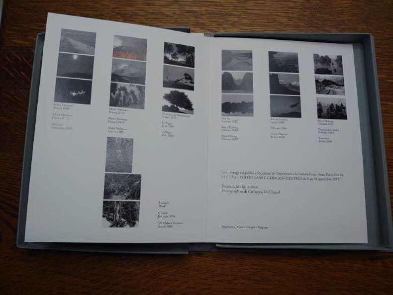 2012 Éditions Dumerchez, sans date, 2012. 22 x 17 cm, en feuilles sous emboîtage toilé. Petite déchirure au dos de l'emboîtage, sinon bel exemplaire. Ouvrage pubblié à l'occasion de l'exposition à la Galerie Forêt Verte à Paris, lors du festival Photo Saint-Germain des Près du 8 au 30 novembre 2012. Textes de Michel Bohbot, photographies de Catherine de Clippel.