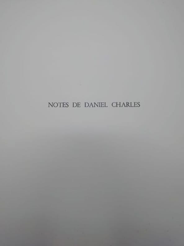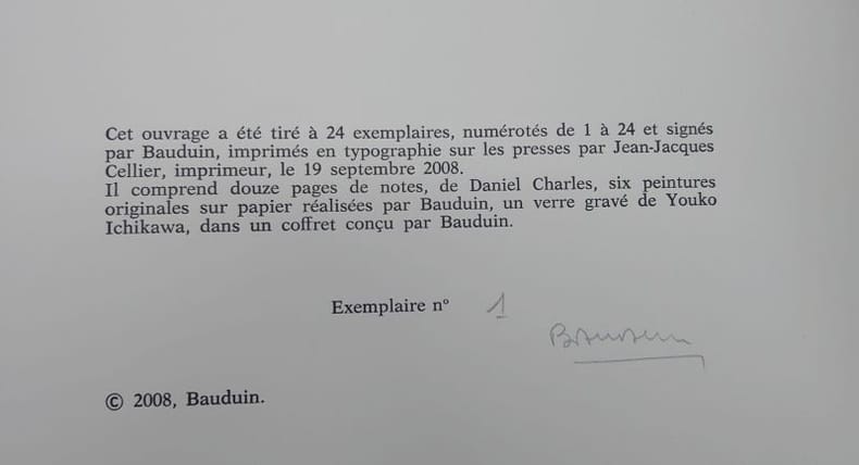 Auto-édition, 19 septembre 2008. Imprimeur Jean-Jacques Cellier. Auteur Textes de Daniel Charles. Verre gravé de Y.Ichikawa. Dans un coffret d'éditeur (33 x 33 cm) : un cahier de 12 pages de notes, de Daniel Charles, 6 peintures originales sur papier de Bauduin, un verre gravé. Ouvrage tiré à 24 exemplaires numérotés et signés par Bauduin, imprimés en typographie sur les presses de Jean-Jacques Cellier.Exemplaire n°1. Le coffret est abîmé mais encore solide, quelques légères rousseurs sinon oeuvres et textes en bel état.