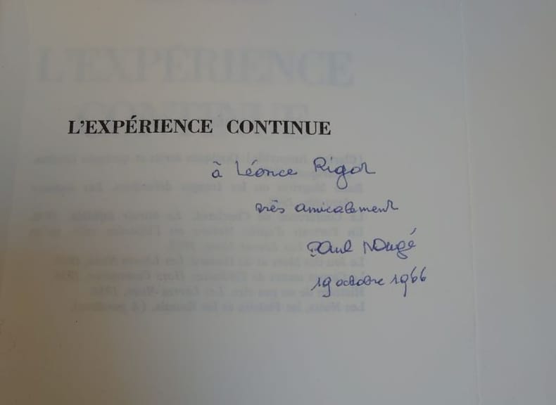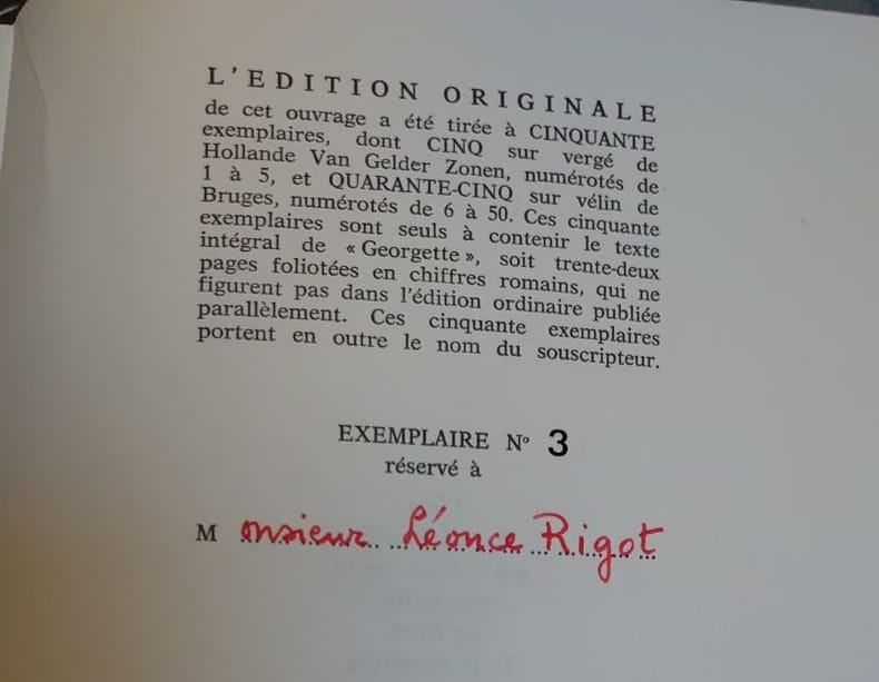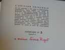 Bruxelles, Éditions de la Revue Les Lèvres Nues, 1966. Un fort volume broché (19,5 x 29 cm) de 435 et xxxii pages. Quelques minimes rousseurs sur le deuxième plat, sinon exemplaire en parfait état, non coupé à très grandes marges. Édition originale. Volume qui rassemble les poèmes de Nougé notamment les poèmes typographiques dont certains sont parus dans Les Lèvres nues. Un des cinq exemplaires numérotés sur vergé de Hollande Van Gelder, réservé à Léonce Rigot, chef du service cinématographique de Bruxelles et proche du Groupe surréaliste de Bruxelles (Il est notamment signataire du tract Pas de quartiers dans la révolution ! : tract de Marcel Arents, Paul Bourgoignie et Marcel Broodthaers, Bruxelles, 7 juin 1947). Exemplaire justifié à l'encre rouge par Paul Nougé et comportant un envoi autographe signé sur la page de faux-titre. Exemplaire bien complet du texte érotique Georgette qui ne figure que dans les exemplaires de luxe (donc dans les cinquante premiers exemplaires) et dont les 32 pages sont foliotées en chiffres romains.