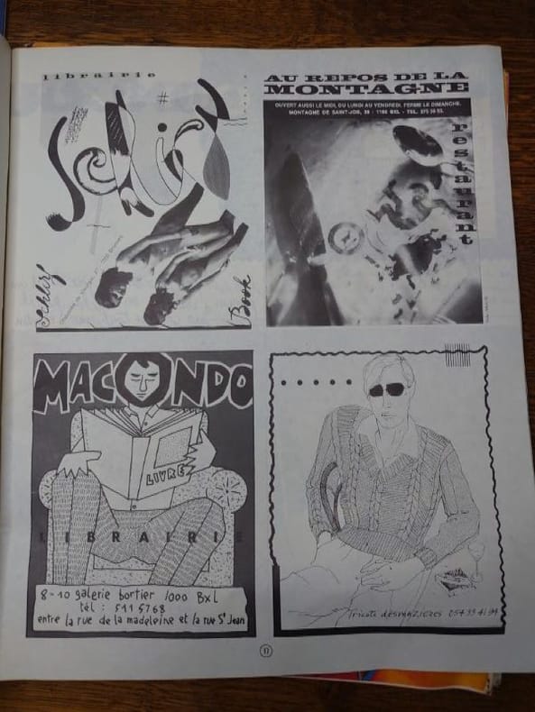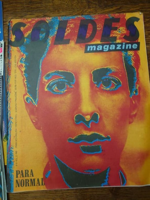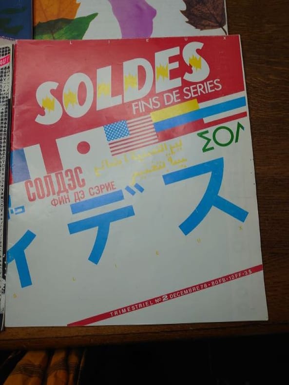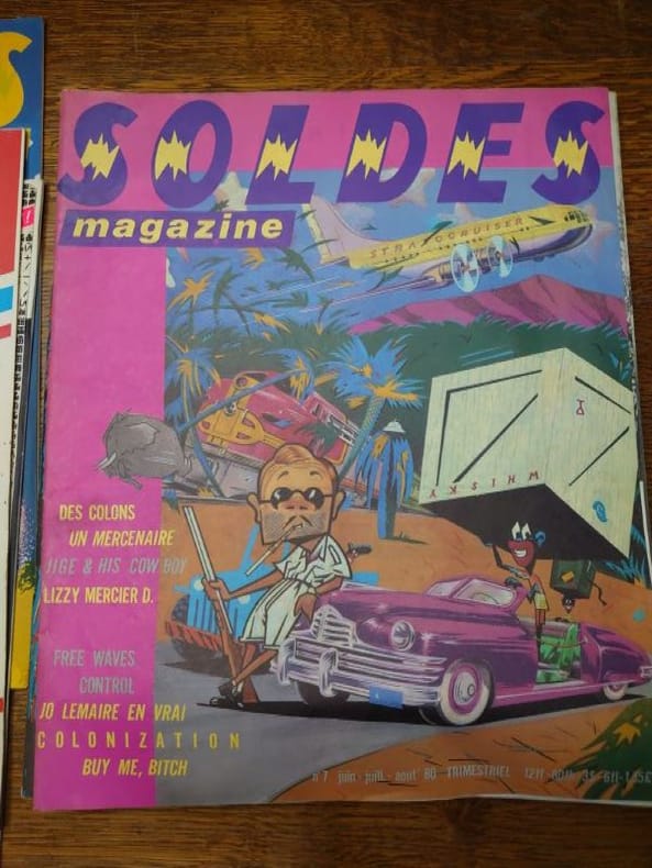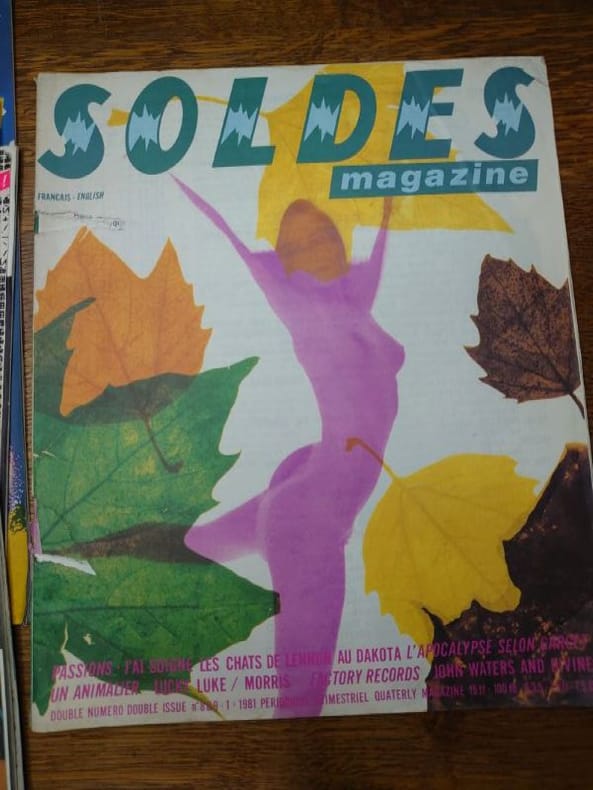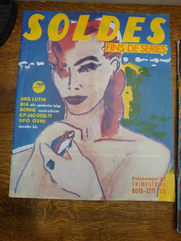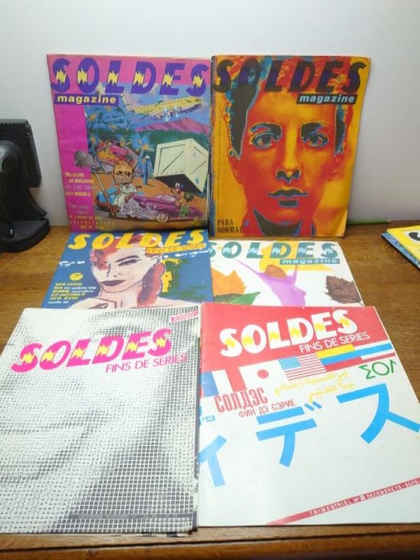 Bruxelles, ADN productions (a.s.b.l.) /Ateliers Du Namurois, 1978/1979/1980/1981. 35 x 29 cm, 6 volumes, les numéros 1, 2 et 3 et le numéros 7, 8-9 et 10. Volumes agrafés. Déchirures au numéro 8-9 sinon bons exemplaires. La revue Soldes, c’est une histoire belge à l’énergie débordant outre-Atlantique. Andy Warhol l’a même qualifiée de «plus belle revue du monde» en 1980, avant de poursuivre : «Les Belges sont incroyables.» Commentaire qui a immédiatement propulsé le magazine sur le devant de la scène internationale. Marc Borgers avait interviewé Warhol pour Soldes Fins de séries sous le pseudonyme de «Jean Dupond de New York City». La revue est née dans le monde de l’underground bruxellois de la fin des années 70. «Soldes Fins de Séries, c’était un trimestriel basé à Bruxelles, notre réponse post-punk/new wave à une époque où nous étions dopés à la musique et aux idées nouvelles», raconte Marc Borgers. La revue raconte alors des tranches de vie en partant à la rencontre de personnages hauts en couleur : l’acteur qui a incarné Tintin au cinéma, une «voyante extralucide», une coiffeuse de Charleroi et même un monsieur chargé de maquiller l’entre-jambes des femmes faisant la couverture de magazines érotiques. Anne Degavre, professeur à l’École de recherche graphique a été embauchée pour faire la mise en page de Soldes en 1980, à peine sortie d’école d’art : «Marc voulait quelqu’un qui n’avait jamais fait de graphisme pour qu’il n’ait pas d’idées préconçues. Ça tombait bien, plaisante-t-elle.C’était une aventure joyeuse et décalée, ultra-originale au niveau du graphisme et du contenu. Ce qui est certain, c’est que Soldes, il n’y avait pas deux revues comme elle.»