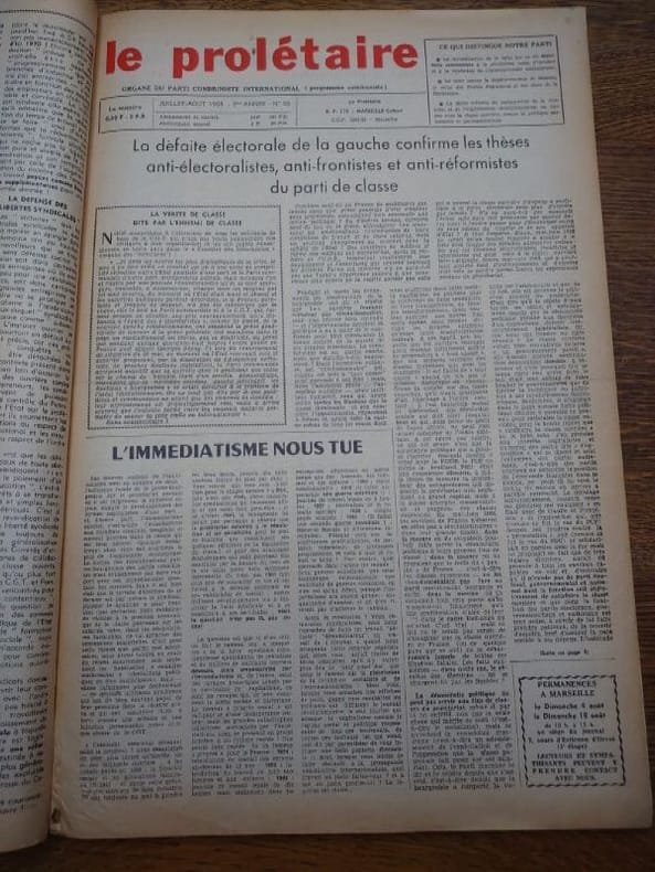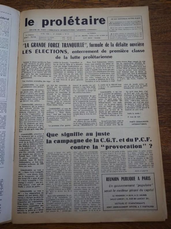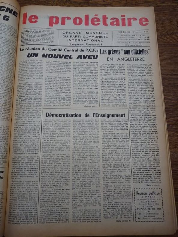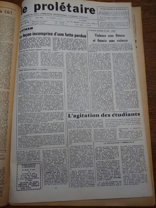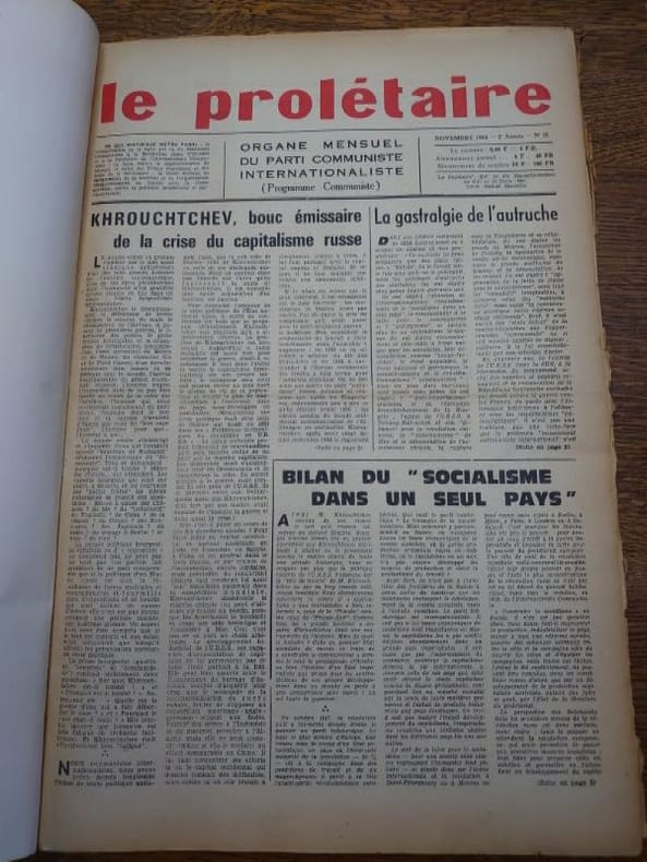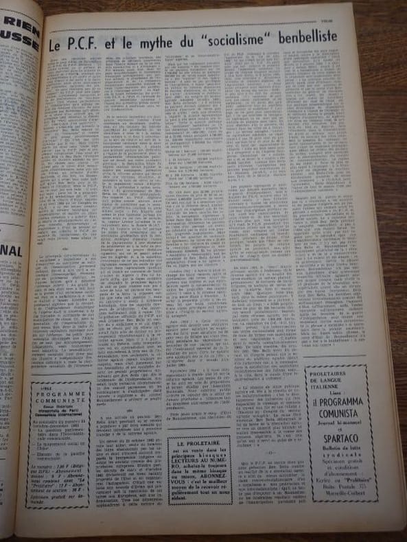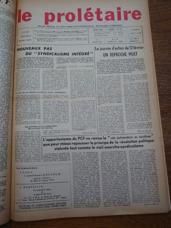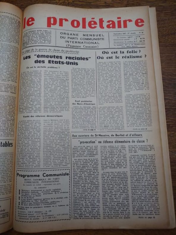 Marseille, 1964/1969. Directeur de publication F. Gambini. Dans une reliure demi toile 44 x 29 cm nous avons les numéros suivant : - 1964 n°15 et 16. - 1965 n°17, et n° 19 à 27. - 1966 n°28 au n°38.- 1967 n°39 au n°49. - 1968 n°50 au n°60 (le numéro 54 de mai 68 est sur un autre papier). - 1969 n°61 au n°71. Bons exemplaires. François Gambini fut pendant une vingtaine d’années le directeur de publication de Programme Communiste (dès son n° 5 en 1959) et du journal Le Prolétaire, organe du Parti communiste international (PCI), dès son numéro 1 (juillet 1963). C’est à ce titre qu’il fut perquisitionné et arrêté à son domicile, puis relâché sans être inculpé, les 5 et 6 décembre 1975 lorsque le gouvernement – dont Jacques Chirac était le premier ministre – prit la décision de réprimer les organisations qui menaient un travail antimilitariste parmi les soldats. Un tract diffusé par le PCI en novembre 1975, appuyant une initiative de soldats du 19e régiment de Besançon, en avait appelé au «droit des soldats à l’organisation» ainsi qu’au «soutien de (leurs) revendications», en combattant «le militarisme bourgeois et ses valets dirigeants réformistes». Ce tract valut l’inculpation de deux militants parisiens du PCI par le juge d’instruction auprès de la Cour de sûreté de l’Etat pour «démoralisation de l’armée». En tout, 47 personnes d’extrême gauche furent inculpées et plusieurs dizaines de soldats mis aux arrêts. En 1979 François Gambini demanda d’abandonner cette responsabilité légale, ce qui fut fait au début de l’année 1980. Les divergences entre les sections «Nord» (Paris et nord de la France) et «Sud» (Rhône et Méditerranée), en 1981, furent à l’origine de sa décision. Lors de l’éclatement de son organisation, François Gambini suivit Suzanne Voûte, la principale théoricienne de l’organisation dans le Sud et à Marseille. Il fit partie du groupe formé autour d’elle qui en 1992 publia la revue théorique Les Cahiers du Marxisme vivant.Maintenant jusqu’au bout des liens avec toutes les tendances de la mouvance bordiguiste, il resta «toujours irréductiblement hostile au capitalisme et à sa société».