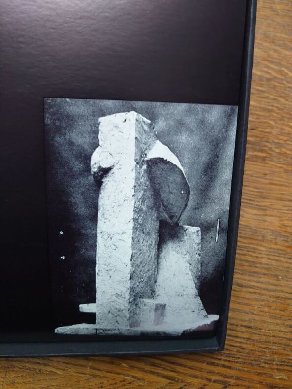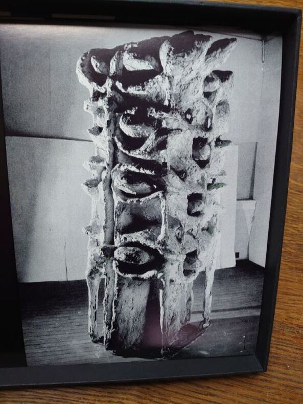 Genève, Editions Claude Givaudan, 1967. 21 X 21 cm. Livre-objet présenté sous une boîte carrée en carton, sérigraphiée sur toutes ses faces (intérieures et extérieures), contenant 62 feuillets carrés. Bel exemplaire. 4 feuillets imprimés sur carton jaune sont le titre, le mode d'emploi, la table et la justification : édition originale tirée à 1204 exemplaires. Les 58 autres feuillets sont imprimés en sérigraphie et illustrés d'une photographie d'une oeuvre d'Étienne Martin (47), 7 sont imprimés en sérigraphie recto/verso, et 4 sont illustrés d'une photographie au recto uniquement. Les photographes : Craven, Robert Descharnes, Leni Iselin, Laurent Pinsard et Marc Vaux.