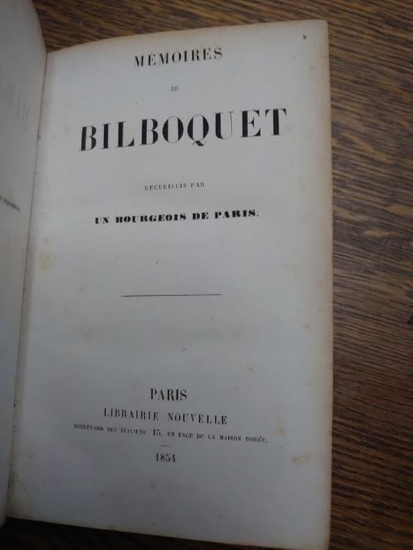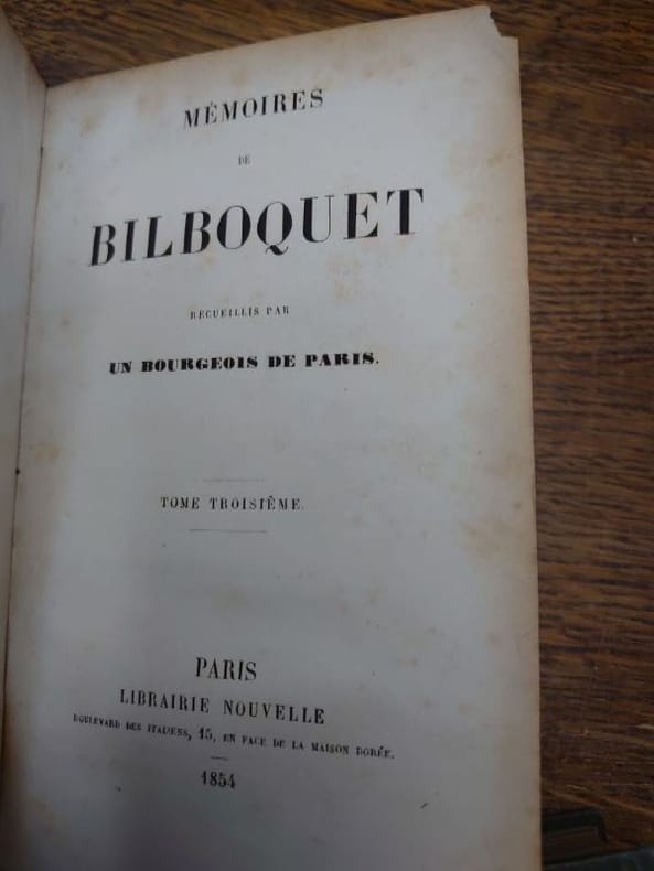 Paris, Librairie Nouvelle, 1854. 17,5 x 11,5 cm, trois vol. de 350 pp., 323 pp. et 312 pp. Reliures demi-basane, dos lisse (reliures de l'époque). Traces de frottements, des rousseurs, états moyens. Vie et société du Paris de la mode et des arts culinaires, des cabarets, des potins mondains, de la politique et de la haute finance à travers le personnage pittoresque et haut en couleur de Bilboquet, par des littérateurs journalistes.