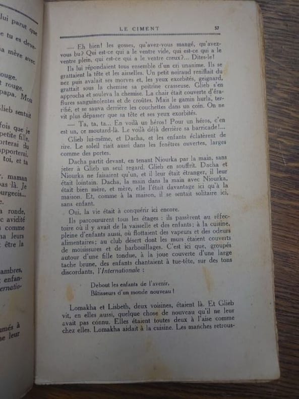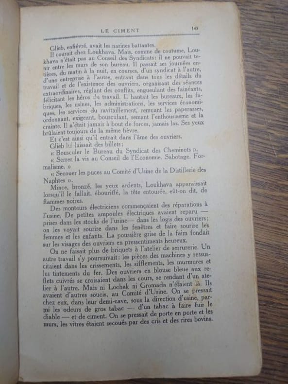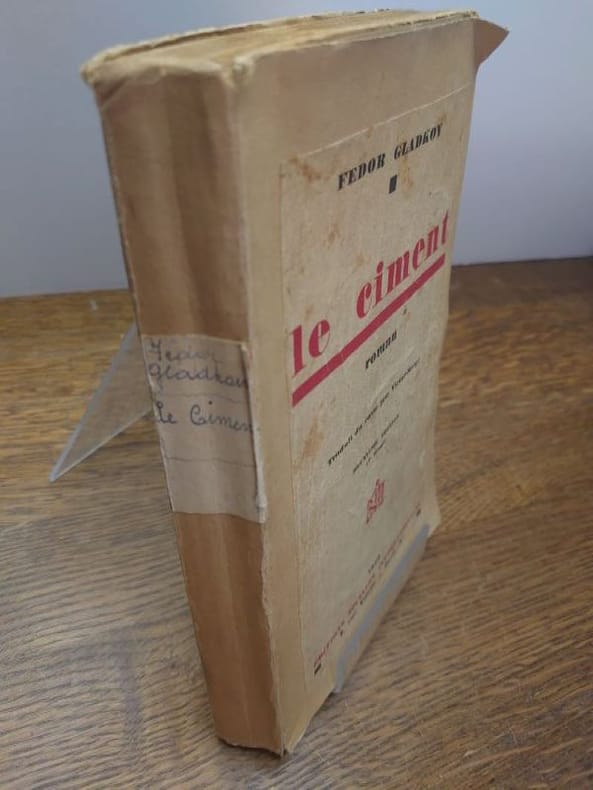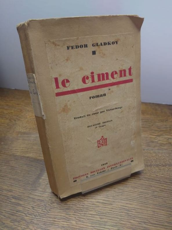 1929 Editions sociales Internationales, 1929. 22,5 x 14 cm, 362 pp. Broché, couverture usée restaurée grossièrement sinon bon exemplaire de cet ouvrage introuvable. Le Ciment est un roman écrit par Fiodor Gladkov et publié en 1925. Il décrit d'une manière crédible, empreinte d'humanité et toute en nuances, la situation de l'Union soviétique vers 1922 : la guerre civile, la famine, les débuts de la Nouvelle politique économique. Tout en exaltant les combattants de l'Armée rouge et les « héros du travail », il ne craint pas de critiquer la bureaucratie aveugle dont fait parfois preuve le Parti.
