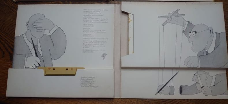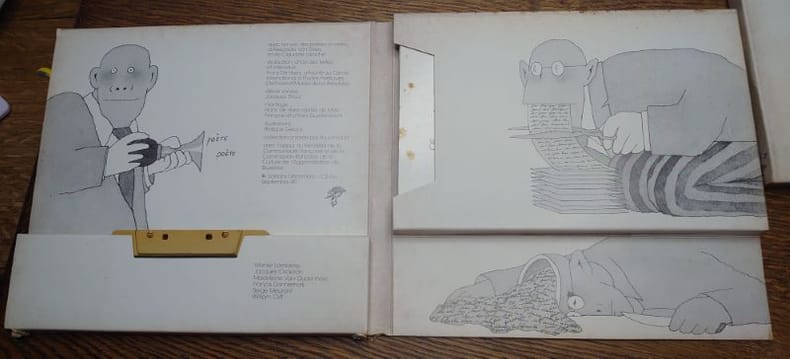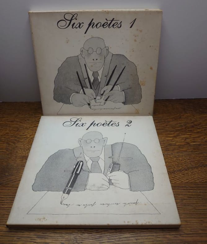 Editions Décembre, 1980. 23 x 21,5 cm, deux coffrets contenant, chacun, un livret non paginé et une cassette audio, avec des poèmes de Werner Lambersy, Jacques Crickillon, Madeleine Van Oudenhove, Francis Dannemark, Serge Meurant, William Cliff, pour le volume 1. Et avec des poèmes de Eugène Savitzkaya, Philippe Dewolf, Marc Quaghebeur, Lucienne Hoyaux, Christian Hubin et Jean-Pierre Verheggen, pour le volume 2. Avec les voix des poètes et celles d'Alexandre Van Sivers et de Claudine Laroche. Coffrets et livrets illustrés par Philippe Geluck. Des rousseurs et un accroc au coffret 1 sinon bons exemplaires.
