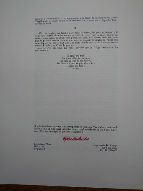 Le fait accompli 132 janvier 1975. Les lèvres nues. 29,5 x 22,5 cm, 4 feuillets non coupés en très bel état. Édition originale, un des 120 ex. num. sur vergé (après 5 ex. sur Hollande).