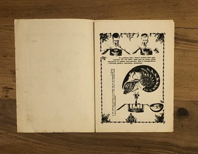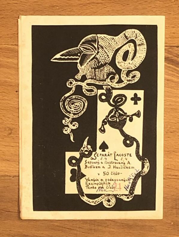 S.l.n.d [Tchécoslovaquie, 1966], chez l'auteur. 15 x 21 cm, en ff. [8 pp.] Bon état général. Rare exemplaire d'une publication clandestine surréaliste tchèque, signé par l'auteur et l'illustrateur. Le nôtre numéroté 21 sur 50 exemplaires.