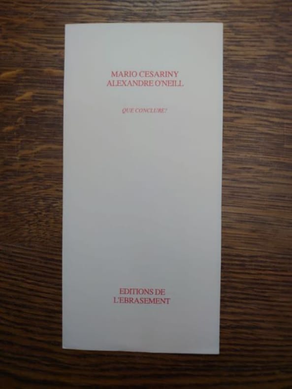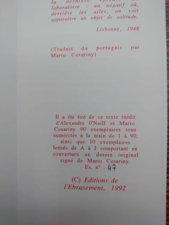 Éditions de l'Ébrasement, 1992. Un feuillet plié de 6 pp. En bel état. Texte inédit de Cesariny et O'Neil, Édition originale, un des 90 ex. num.