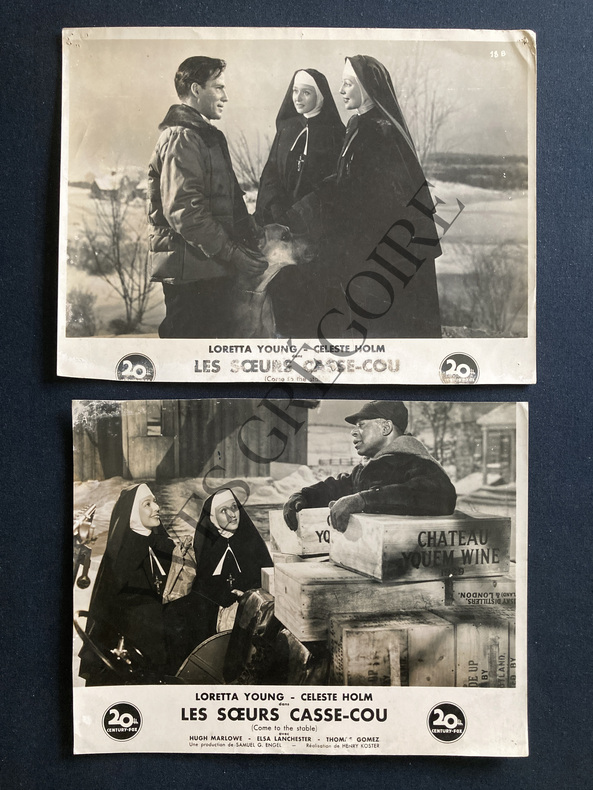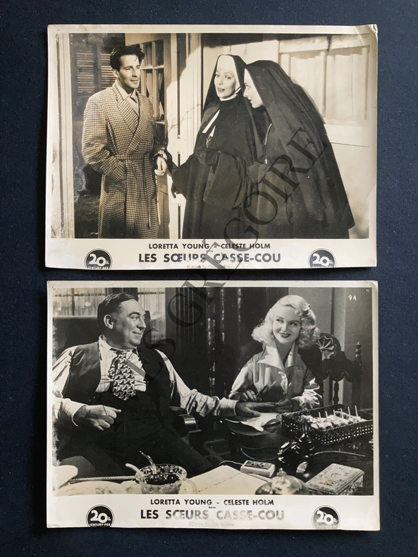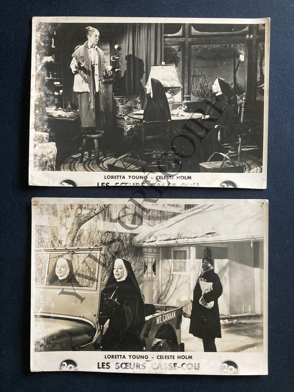 FORMAT 18,5 CM X 28,5 CM DES PHOTOGRAPHIES SANS TENIR COMPTE DES MARGES DECOUPEES-LORETTA YOUNG-CELESTE HOLM-TRACES D'HUMIDITE SUR CERTAINES PHOTOS-DES POINTS DE PUNAISE EN MARGES
