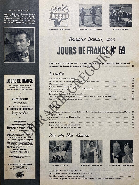 LAURENCE OLIVIER EN COUVERTURE-LES CANDIDATS BATTENT LA CAMPAGNE (EDGAR FAURE, F MITTERRAND, CHABAN-DELMAS,.)BÉNOUVILLE-DEVANT LES GENS DU VOYAGE LA NUIT MIRACULEUSE-LA BELLE ET LE CLOCHARD-LAURENCE OLIVIER A GAGNÉ SA PLUS GRANDE BATAILLE-LE GRAND PRIX NATIONAL DES ARTS À ANDRÉ LHOTE, PHOTO-FOOTBALL: FRANCE/BELGIQUE-COUV UN PEU FROTTÉE-COMPLET