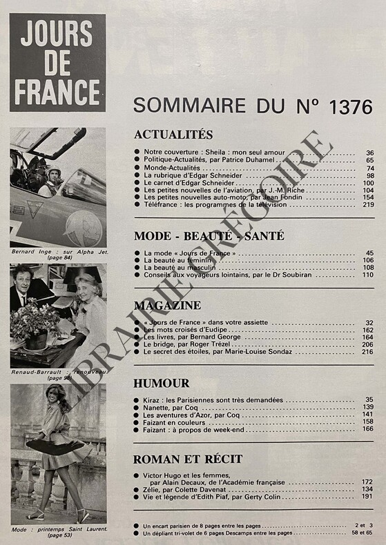 226P-EN COUVERTURE SHEILA:MON SEUL AMOUR-LA MODE JOURS DE FRANCE-FRANÇOIS MITTERRAND VINGT ET UNIÈME PRÉSIDENT DE LA RÉPUBLIQUE-LE DRAME DE ZIZI-PUB PERRIER/G VILAS-VIE ET LÉGENDE D'EDITH PIAF PAR GERTY COLIN