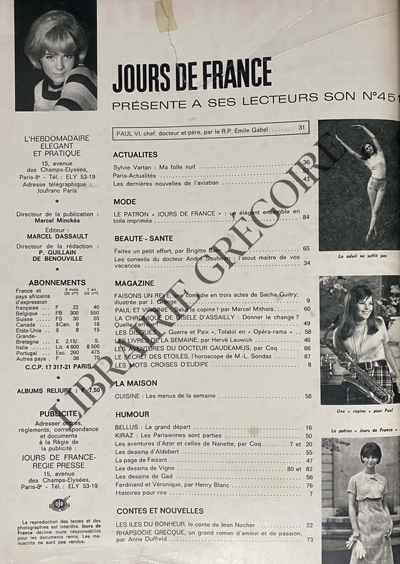 88 PAGES FORMAT 26,5 CM X 34 CM-SYLVIE VARTAN EN COUVERTURE,PULL A RAYURES ROUGES BLEUES ET BLANCHES-"LES ILES DU BONHEUR",LES CONTES DE JOURS DE FRANCE PAR JEAN NOCHER-PAUL VI CHEF,DOCTEUR ET PERE,PAR LE REVEREND PERE GABEL-SYLVIE VARTAN:LA FOLLE NUIT DE LA NATION? FORMIDABLE!,4P PAR PIERRE BENICHOU,11 PHOTOS,HALLYDAY-PUBLICITE ACHILLE ZAVATTA POUR LES CHEMISES BRIDGE EN TERGAL-COUVERTURE LEGEREMENT FROTTEE