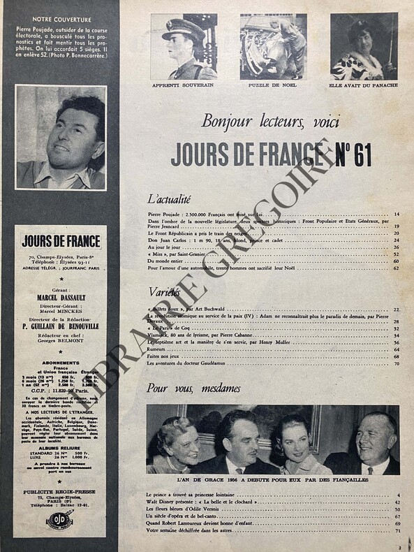 72 PAGES-PIERRE POUJADE EN COUVERTURE-LE PRINCE A TROUVE SA PRINCESSE LOINTAINE-2 500 000 FRANCAIS ONT MISE SUR LUI/POUJADE-DON JUAN CARLOS 1 METRE 90,18 ANS,BLOND,PRINCE ET CADET-VLAMINCK 80 ANS DE LYRISME-LES FLEURS BLEUES D'ODILE VERSOIS-MISS PAR SAINT-GRANIER-TRENTE HOMMES ONT SACRIFIE LEUR NOEL POUR CETTE VOITURE/GREGOIRE/CHAPRON-DANS "PAPA, MAMAN, MA FEMME ET MOI" ROBERT LAMOUREUX DEVIENT BONNE D'ENFANT, 1 PAGE, 3 PHOTOS-DECOUPE SANS CONSEQUENCES P45/46