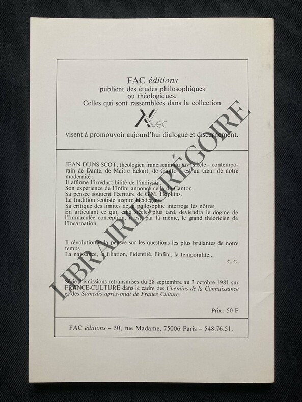 FAC - France-Culture. 1982. In-8. Broché. Etat d'usage, Couv. légèrement passée, Dos satisfaisant, Intérieur frais. 102 pages. Traces d'étiquette sur les plats.. . . . Classification Dewey : 921-Philosophes et psychologues