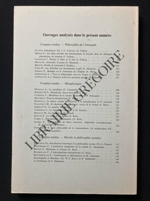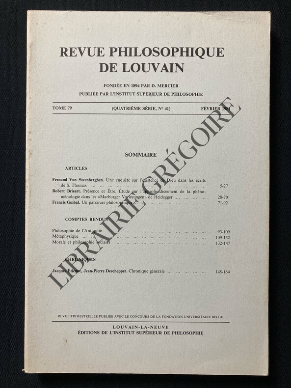 FERNAND VAN STEENBERGHEN,UNE ENQUETE SUR L'EXISTENCE DE DIEU DANS LES ECRITS DE S.THOMAS (5-27)-ROBERT BRISART,PRESENCE ET ETRE.ETUDE SUR L'APPROFONDISSEEMENT DE LA PHENOMENOLOGIE DANS LES "MARBURGER VORLESUNGEN" DE HEIDEGGER (28-70)-FRANCIS GUIBAL,UN PARCOURS PHILOSOPHIQUE (71-92)-COMPTES RENDUS: PHILOSOPHIE DE L'ANTIQUITE (93-109), METAPHYSIQUE (109-132),MORALE ET PHILOSOPHIE SOCIALES (132-147)-CHRONIQUES: JACQUES ETIENNE,JEAN-PIERRE DESCHEPPER,CHRONIQUE GENERALE (148-164)-(14C)