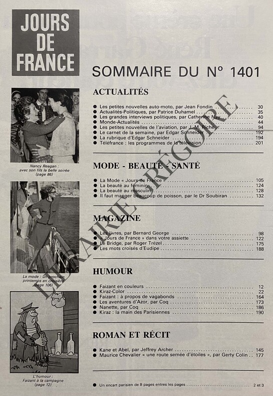 208 PAGES-GEORGES BRASSENS EN COUVERTURE-CATHERINE NAY/FRANCOIS D'AUBERT-BRASSENS: IL ETAIT LA CHANSON FRANCAISE/14P-DIANA AU PAYS DE GALLES/8P-CHARLOTTE ET JEAN MICHEL JARRE: ILS SOURIENT A LA CHINE-RAPHAELE BEATRICE GENEVIEVE 3 PRENOMS CELEBRES/BILLETDOUX/PRIVAT/JURGENSEN-EDDY ET ISABELLE/ LE CINEMA AVEC PASSION/EDDY MITCHELL/ISABELLE HUPPERT/LE COUP DE TORCHON-QUAND LE COMMISSAIRE FAIT SURFACE/NADINE JOLY-CLAUDE BRASSEUR ABSENT POUR CAUSE D'AVENTURE/6P-NANCY REAGAN: BRAVO MON FILS-JULIO IGLESIAS: UN PLATEAU EN OR-A 25 ANS SON SWING VAUT 36 000 F/TIM SIMPSON-IL Y A CINQUANTE ANS VOL DE NUIT RECEVAIT LE PRIX FEMINA L'OEUVRE DE SAINT EXUPERY-CHANEL CROISIERE COLLECTION BOUTIQUE/16P-MAURICE CHEVALIER UNE ROUTE SEMEE D'ETOILES/GERTY COLIN/5P