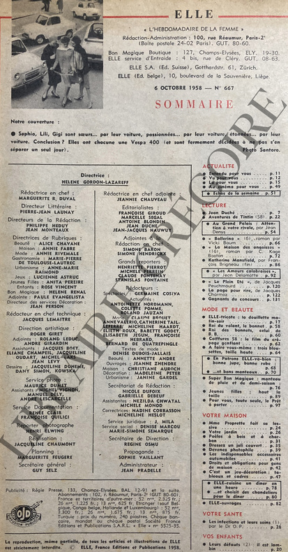 152 PAGES-EN COUVERTURE 3 MANEQUINS ET 4 2CV VESPA/COULEURS-HISTOIRE D'UN GRAND DADAIS/BERTRAND POIROT DELPECH-PUBLICITE POPELINE D'ALSACE/VILLAGE SUISSE A PARIS/STAND D'EUGENIE-DU NOUVEAU AU DOSSIER TOWNSEND-ROI DES BONNETS:CELUI DE B.B.-CARMELA ET ANTONINO SONT MORTS/CALABRE