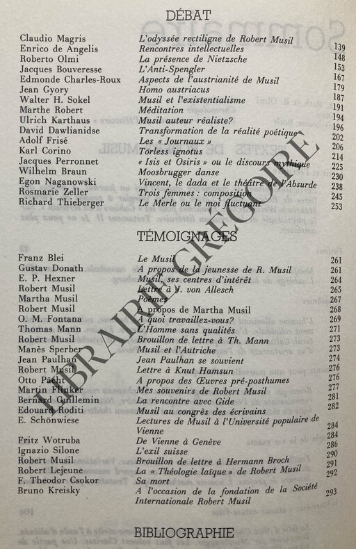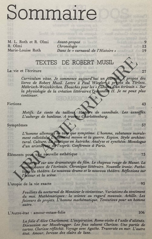 Textes inédits de Robert Musil : Je commence aujourd’hui un journal, Sur la physiologie de la création, Testament II, Je ne peux plus continuer, Histoire de cannibale, Le conte du tailleur, Les assoiffés, L’auberge de banlieue, À travers Charlottenbourg, Éruption de l’instant, L’homme allemand en tant que symptôme, Le théorème de l’amorphisme humain, La situation de notre génération, Rôle de l’idéologie par rapport à la vie, L’Allemand moyen et la guerre, Espion, etc. Essais, articles et témoignages de Marthe Robert, Jean Paulhan, Ignazio Silone, Thomas Mann, Jacques Bouveresse, Edmonde Charles-Roux, etc.