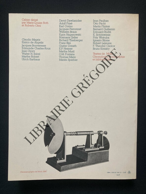Éditions de l'Herne, 1982. In-4° br. couv.ill. Cahier dirigé par Marie-Louise Roth et Roberto Olmi. Collection Cahiers de l'Herne. Ill. n. & bl. Contient un choix de textes de Musil. 350 p.