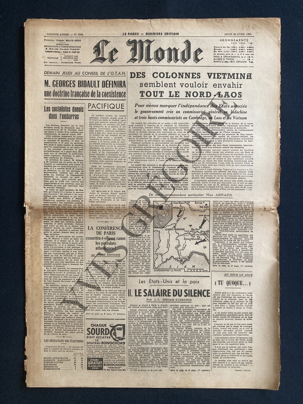 12 PAGES-34 CM X 50 CM-DES COLONNES VIETMINH SEMBLENT VOULOIR ENVAHIR TOUT LE NORD-LAOS, CARTE-LES ETATS-UNIS ET LA PAIX II LE SALAIRE DU SILENCE, PAR J.-J. SERVAN-SCHREIBER, SUITE P3-DEMAIN JEUDI AU CONSEIL DE L'O.T.A.N. M. GEORGES BIDAULT DEFINIRA UNE DOCTRINE FRANCAISE DE LA COEXISTENCE PACIFIQUE-ISRAEL FETE SON CINQUIEME ANNIVERSAIRE, PAR PHILIPPE BEN-LES ELECTIONS MUNICIPALES A PARIS-L'ALLAITEMENT MATERNEL GRAND FACTEUR DE LUTTE CONTRE LA MORTALITE INFANTILE-LE FESTIVAL DE CANNES HEROISME FRANCAIS, PATISSERIE VIENNOISE, DRAME JAPONAIS, FEERIE DE PACOTILLE "MADE IN USA", PAR JEAN DE BARONCELLI-AUX BOUFFES PARISIENS "LE RAVAGEUR" DE GABRIEL CHEVALIER-RENEE JEANMAIRE ETOILE D'UN "SHOW" SUR BROADWAY-ENCART POUR EDITH PIAF ET JACQUES PILLS DANS "LE BEL INDIFFERENT" A MARIGNY-ENCART POUR "LE SALAIRE DE LA PEUR" DE CLOUZOT-LE PROCES DE REGINALD CHRISTIE LE "LANDRU LONDONIEN" S'EST OUVERT CE MATIN
