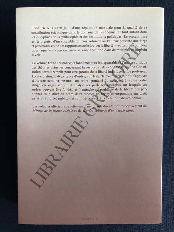 Classique des sciences sociales et politiques du XXe siècle, cet ouvrage est considéré comme la "Bible" du libéralisme moderne et est commenté, à ce titre, dans le monde entier. Fondé sur une épistémologie originale mettant l'accent sur le caractère limité et dispersé des connaissances humaines, il développe les notions d'"ordre spontané de société" de "catallaxie" (économie d'échange) et de "démarchie" (terme équivalent à démocratie libérale). Les trois tomes traitent respectivement du droit, de l'économie et des institutions politiques. Voir le sommaire sur photos jointes.