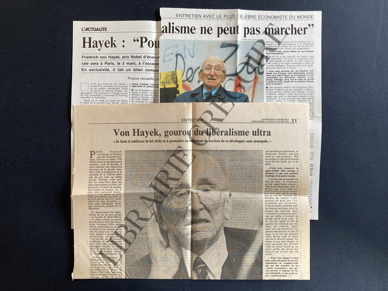 COLLECTION LIBRE ECHANGE-UNE NOUVELLE FORMULATION DES PRINCIPES LIBERAUX DE JUSTICE ET D'ECONOMIE POLITIQUE-TRADUIT DE L'ANGLAIS PAR RAOUL AUDOUIN-208 PAGES-15 CM X 22,5 CM-JOINT ARTICLE "HAYEK: "POURQUOI LE SOCIALISME NE PEUT PAS MARCHER", PROPOS RECUEILLIS PAR GUY SORMAN SUR 2 PAGES, SAMEDI 18 FEVRIER 1984 (SOURCE NON IDENTIFIABLE)-JOINT ARTICLE "ENTRETIEN VON HAYEK, GOUROU DU LIBERALISME ULTRA", PROPOS RECUEILLIS PAR CHRISTIAN DESCAMPS, LE MONDE AUJOURD'HUI DIMANCHE 11 LUNDI 12 MARS 1984-(1A)