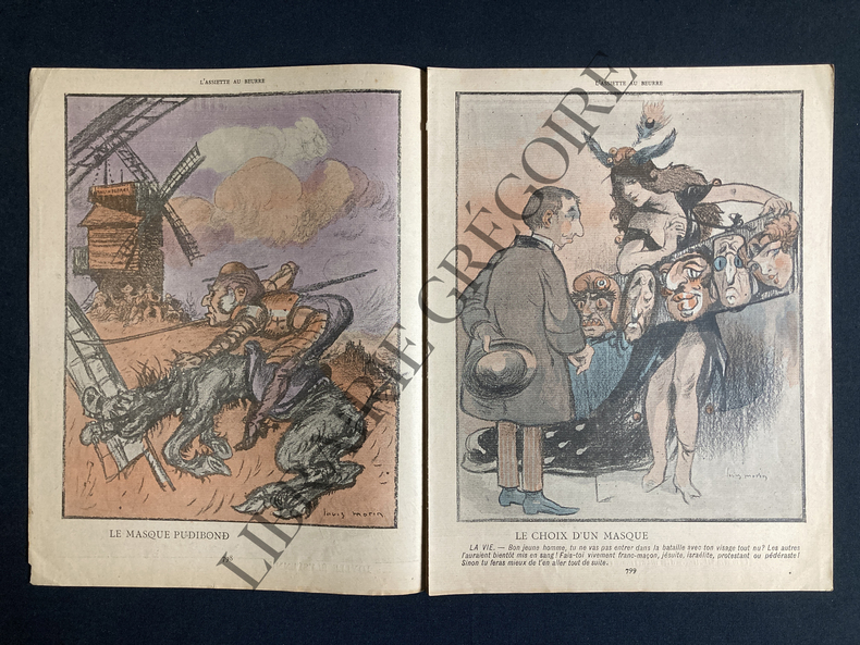 16 PAGES FORMAT 24,5 CM X 31,5 CM-COUVERTURE COULEURS, FAUNE ET MARIANNE-P2: "LE MASQUE PUDIBOND", DON QUICHOTTE, COULEURS-P3: "LE CHOIX D'UN MASQUE", FRANC-MACONNERIE, ANTISEMITISME, COULEURS-P4 ET P5: "MASQUES DEVOTS", JESUS, COULEURS-P6: "MASQUE POLITIQUE", MARIANNE EN PANTIN, COULEURS-P7: "GRAND-PERE ET PETIT PERE", NICOLAS II, COULEURS-P8 ET P9: "LE DRESSAGE DU LOCATAIRE", COULEURS-P10: "MASQUES ANCIENS", COULEURS-P11: "MASQUES MODERNES", COULEURS-P12 ET P13: "LE MASQUE", COULEURS-P14: "MASQUES MONDAINS", COULEURS-P15: "MASCARADES PROCHAINES", TRIBUNAL REVOLUTIONNAIRE, COULEURS-P16: "LE TRONE A SURPRISE", GUILLOTINE, SANS CULOTTE, COULEURS