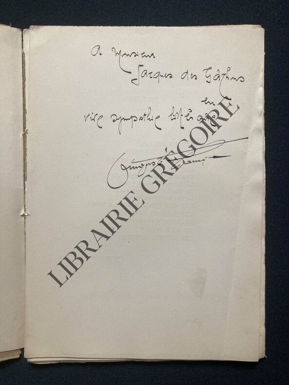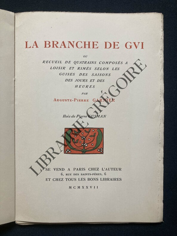 14,5 CM X 20,3 CM-56 PAGES-EXEMPLAIRE SUR LAFUMA N°384 D'UN TIRAGE DE 600-COUVERTURE REMPLIEE-ENVOI DE L'AUTEUR AU ROMANCIER ET CRITIQUE LITTERAIRE JACQUES DES GACHONS (PLIURE EN MARGE DROITE)-BOIS DE PIERRE GUSMAN-DOS QUASI ABSENT-INTERIEUR TRES PROPRE-(JDG27)