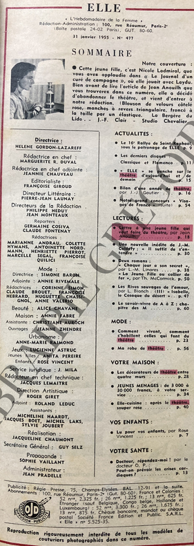 68 PAGES-24 CM X 31 CM-EN COUVERTURE "NE MANQUEZ PAS DE LIRE: "LETTRE A UNE JEUNE FILLE" UN GRAND ARTICLE DE JEAN ANOUILH",L'ACTRICE NICOLE LADMIRAL EN BUSTE DE PROFIL-LE THEATRE D'AUJOURD'HUI ET DE DEMAIN, PHOTO-JEAN-JACQUES GAUTIER ETABLIT POUR VOUS SON BILAN D'UNE ANNEE DE THEATRE, 2P, 31 PHOTOS-LETTRE A UNE JEUNE FILLE QUI VEUT FAIRE DU THEATRE, 6P PAR JEAN ANOUILH, ILLUSTRATIONS NOIR ET BLANC DE MOLES-COMMENT VIVENT ET S'HABILLENT CELLES QUI FONT DU THEATRE, CATHERINE LE COUET, FRANCETTE VERNILLAT, MARTINE SARCEY, 5 PAGES, 15 PHOTOS-QUAND LES DECORATEURS DE THEATRE SE RETROUVENT ENTRE 4 MURS., PAR MICHELE PERREIN, SUZANNE REYMOND, JEAN-DENIS MALCLES, GEORGES WAKHEVITCH, LEONOR FINI, 8 PHOTOS-PUBLICITE LUSTUCRU, CAMION ET SCOOTER-PUBLICITE CINZANO PAR GUY GEORGET-VISAGES DE FRANCE, 2P, 13 PHOTOS