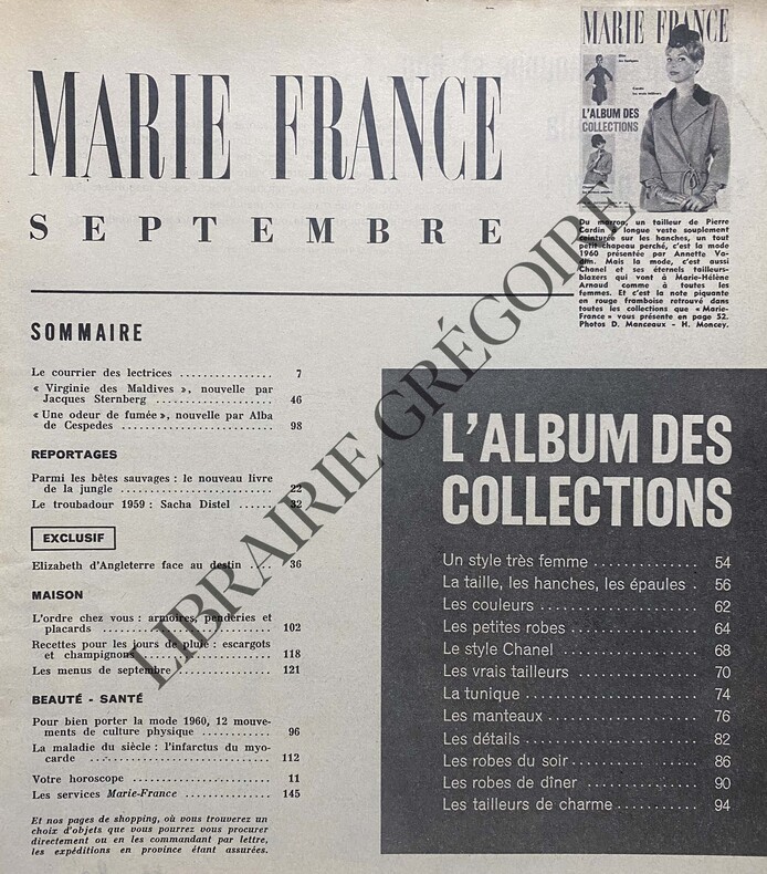 148 PAGES-24 CM X 31 CM-EN COUVERTURE "L'ALBUM DES COLLECTIONS DIOR LES TUNIQUES CARDIN LES VRAIS TAILLEURS CHANEL LES FORMES SOUPLES", 3 PHOTOS (ANNETTE VADIM)-MYLENE DEMONGEOT POUR PUBLICITE "LUX"-SACHA DISTEL C'EST LE NOUVEAU TROUBADOUR, 4P, 3 PHOTOS-ELISABETH FACE AU DESTIN, 6P-LE VERITABLE ET MERVEILLEUX NAUFRAGE DE VIRGINIE DES MALDIVES, ILLUSTRATION JACQUES POIRIER-L'ALBUM DES COLLECTIONS D'HIVER, 44P-UNE ODEUR DE FUMEE, NOUVELLE INEDITE PAR ALBADE CESPEDES, 4P-PITIE POUR "CAROL", 3P