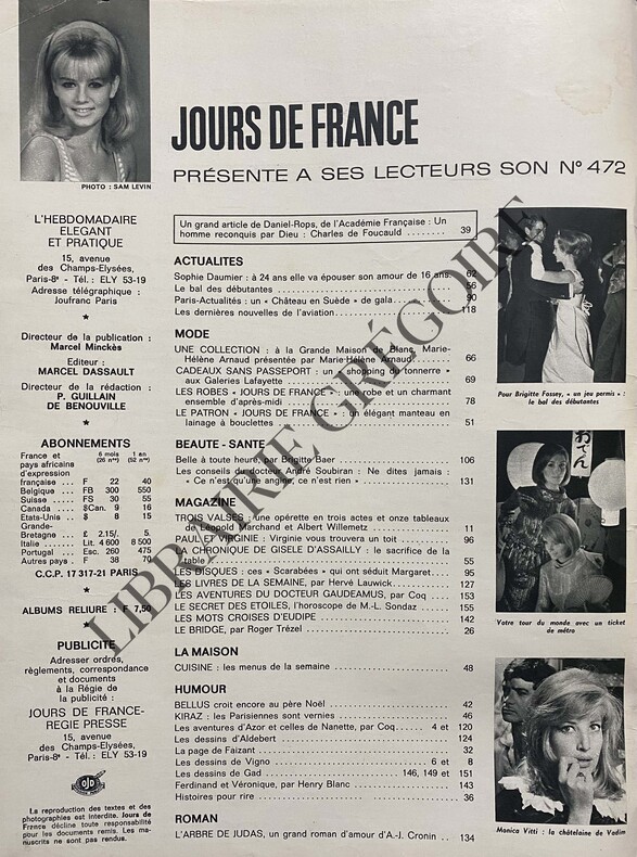 156 PAGES-26,5 CM X 34 CM-EN COUVERTURE: "SOPHIE DAUMIER LE PLUS CHARMANT ROMAN D'AMOUR DE L'ANNEE", GROS PLAN COULEURS HAUT A BRETELLES ROUGE ET BLANC (SAM LEVIN)-HERVE MORVAN POUR PUBLICITE "L'ALSACIENNE BISCUITS"-UN HOMME RECONQUIS PAR DIEU: CHARLES DE FOUCAULD, PAR DANIEL-ROPS-DESSINS DE KIRAZ SUR 2P "LES PARISIENNES SONT VERNIES"-LES "DEBS", 6P, MURIEL BELMONDO, BRIGITTE FOSSEY, ODILE PFLIMLIN-SOPHIE DAUMIER A 24 ANS ELLE VA EPOUSER SON AMOUR DE 16 ANS, 4P PAR YVES SALGUES, 4 PHOTOS-MODE: MARIE-HELENE ARNAUD A LA GRANDE MAISON DE BLANC, 5P-SAGAN-VADIM: L'INVITATION AU "CHATEAU", 4P, 11 PHOTOS, ELGA ANDERSEN, MYLENE DEMONGEOT, JULIETTE GRECO,.-RADIOLA ET LOUIS FERAUD PRESENTENT LEURS VEDETES 1964, 8P-VARIETES: LES SCARABEES A BUCKINGHAM PALACE, PHOTO AVEC MARGARET D'ANGLETERRE-BELLE A TOUTE HEURE, PHOTO CATHERINE DENEUVE PLEINE PAGE