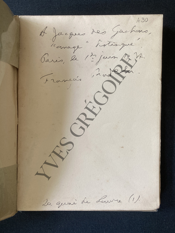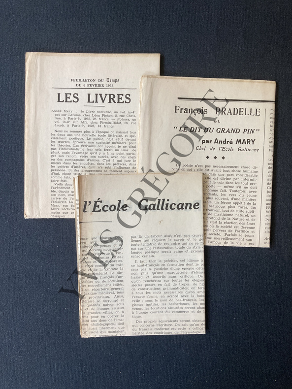 PRECEDE D'UN OMAGE EN TROIS RONDEAUS AU GRANT PIN DE MACE ET A LA MEMOIRE DE JORGE PRADELE, PAR ANDRE MARY CHEF DE L'ECOLE GALICANE-BROCHE-COUVERTURE REMPLIEE-ENVOI DE L'AUTEUR AU ROMANCIER ET CRITIQUE LITTERAIRE JACQUES DES GACHONS-NON COUPE-JOINT ARTICLE DE "L'AVENIR" DU 11 JUIN 1936: "FRANCOIS PRADELLE ET "LE DIT DU GRAND PIN" PAR ANDRE MARY CHEF DE L'ECOLE GALLICANE"-JOINT ARTICLE DU "TEMPS" DU 6 FEVRIER 1936: CRITIQUE D'ANDRE THERIVE POUR "LE LIVRE NOCTURNE" D'ANDRE MARY-JOINT ARTICLE "LE MANIFESTE DE L'ECOLE GALLICANE" PAR ANDRE MARY ET AU RECTO "POEMES CHOISIS D'ANDRE MARY"-NON COUPE-(JDG35)